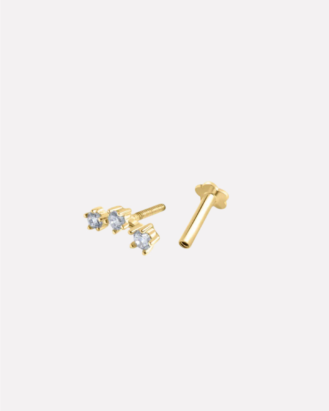 Tri Zirconia Flat Back Screw Stud Earrings in 92.5 sterling silver, 14K gold plated with...
