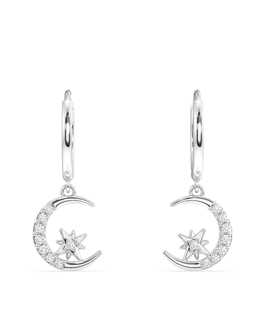 Celestial-inspired Zircon Moon With Star hoops in 92.5 silver, rhodium plated with 5A+ zirconia stones....