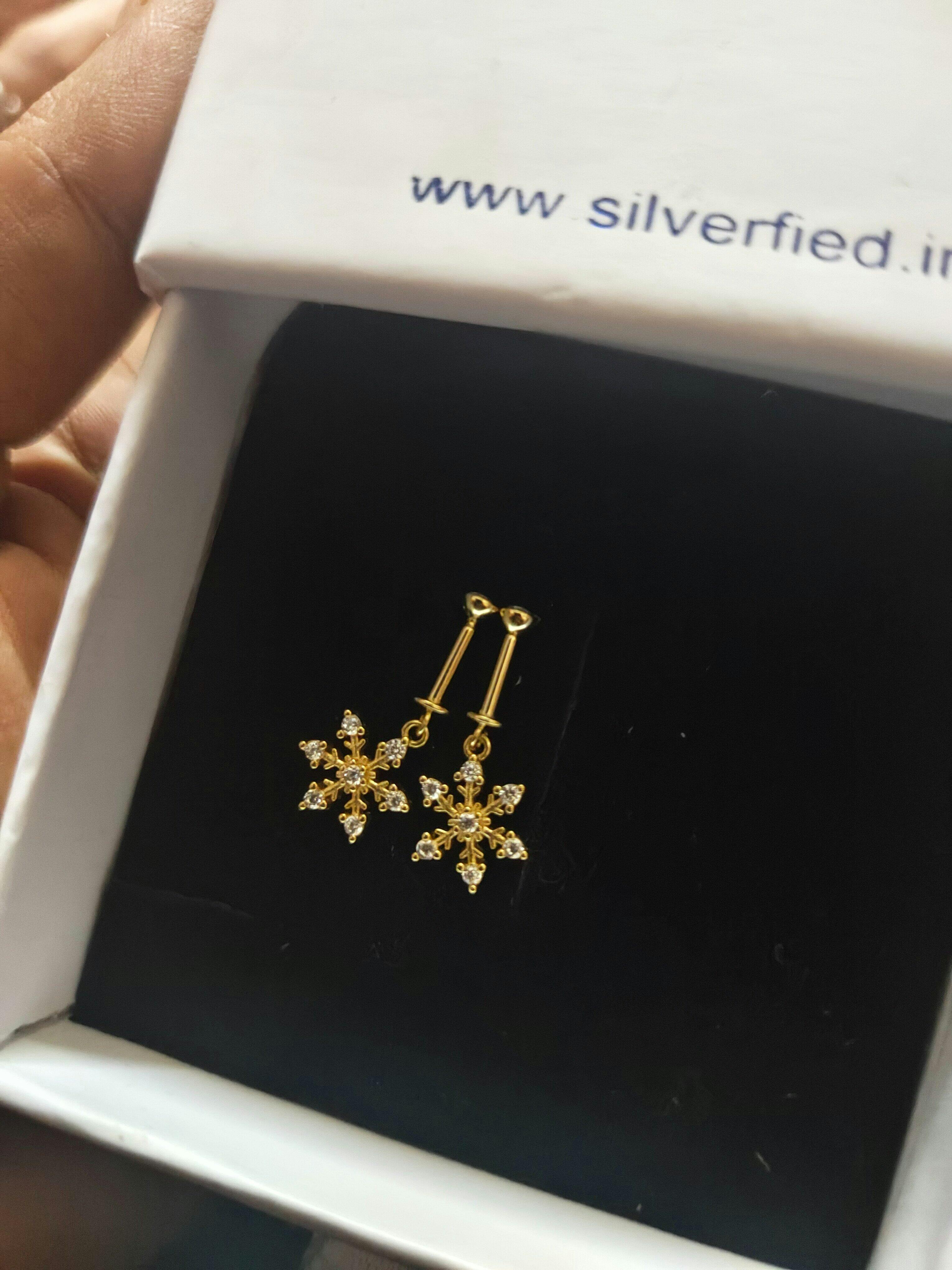 'Ice On Ear' Snowflake Screw Helix Hanging Earrings in 92.5 sterling silver with 14K gold plating and 5A+ zirconia stones. The sparkling snowflake design creates icy elegance and brilliance for helix piercings, perfect for layering, gifting, or adding a festive, sparkling accent.