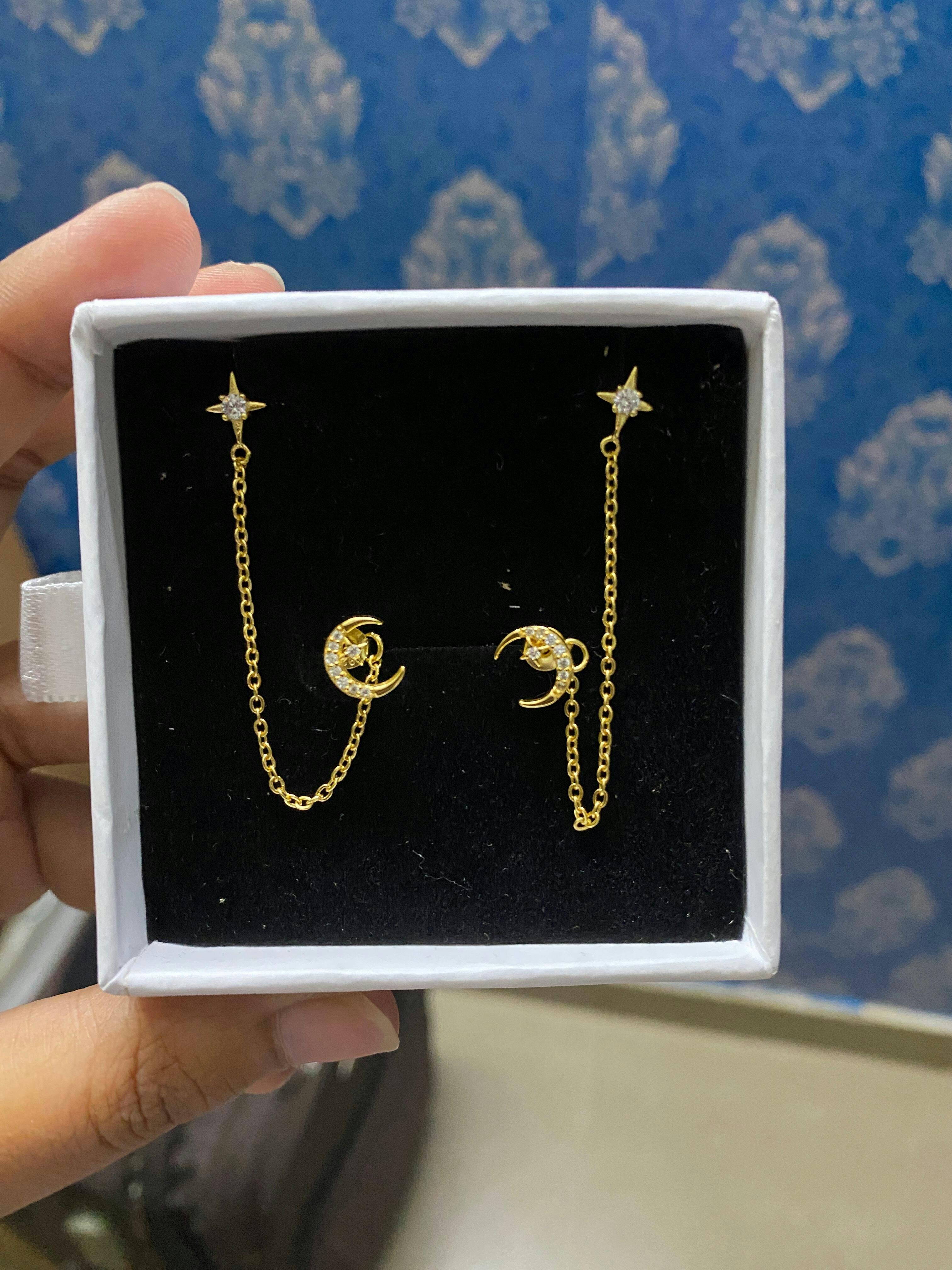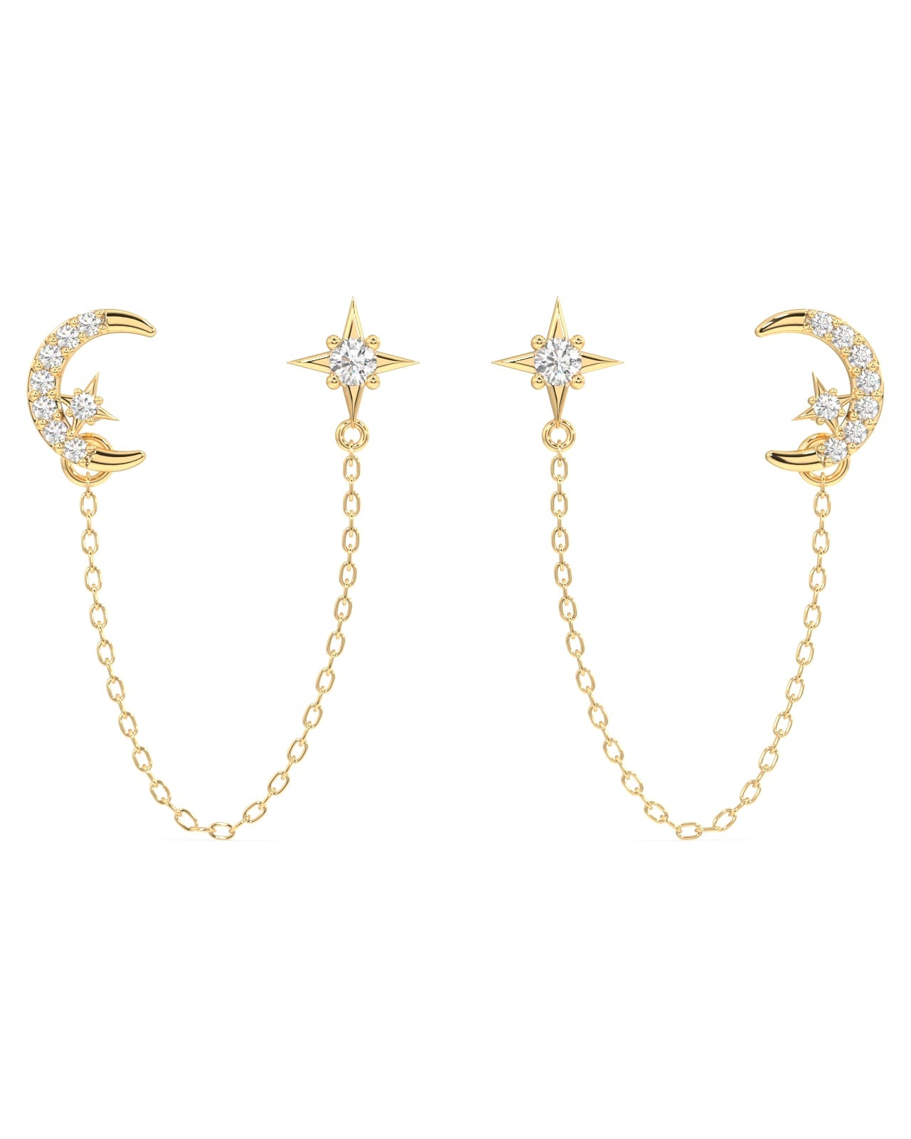Moon Star 3-In Connector Chain Earrings in 92.5 sterling silver with 5A+ zirconia stones, 14K gold plated. Celestial-inspired chain design with moon and star charms adds sparkle and charm, ideal for gifting or layering.