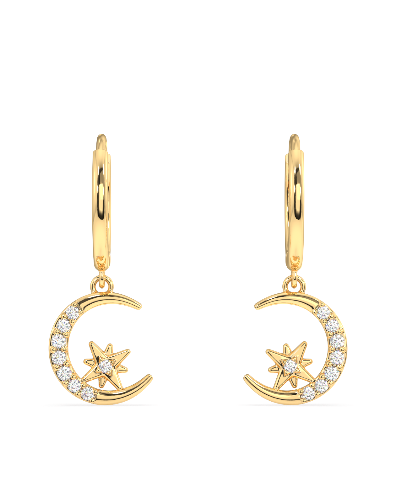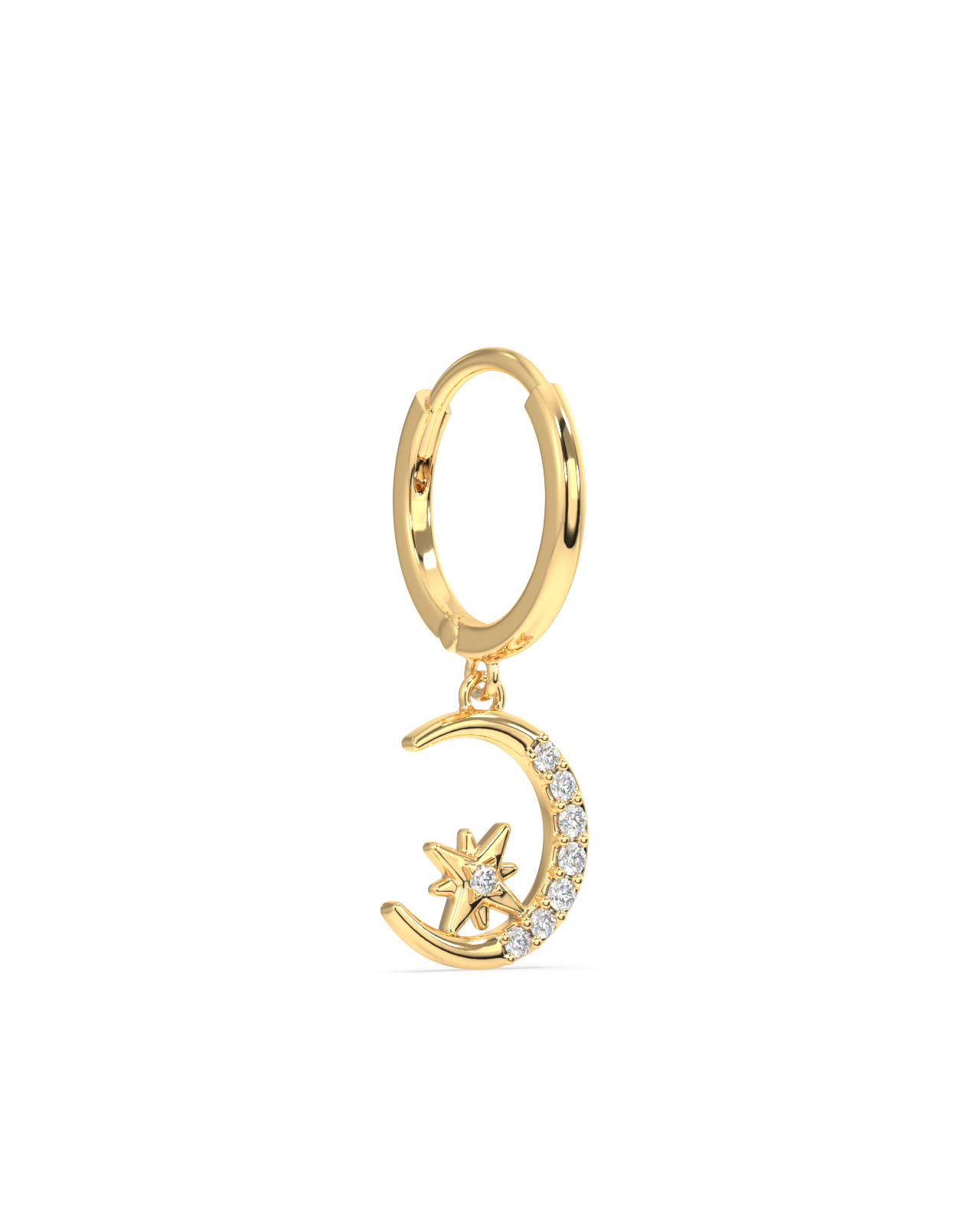 Chic Zircon Moon With Star hoops in 92.5 silver, 14K gold plated with 5A+ zirconia stones. The golden finish highlights the celestial motif, creating a sparkling and dreamy statement accessory.