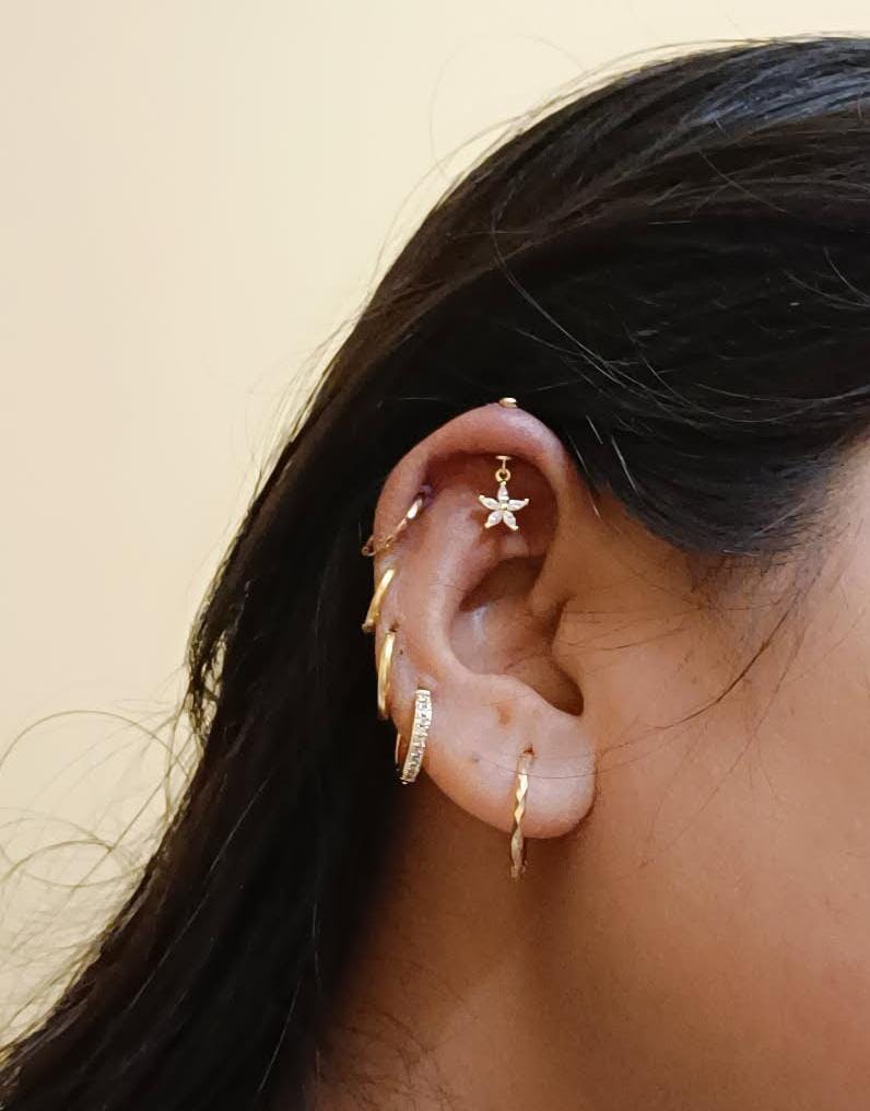 Marquise Starfish Helix Hanging Earrings in 92.5 sterling silver, 14K gold plated with 5A+ zirconia stones. Ocean-inspired marquise starfish motifs add sparkling charm, fluid movement, and playful elegance to helix piercings, ideal for layered styling, gifting, or enhancing your ear jewelry collection.