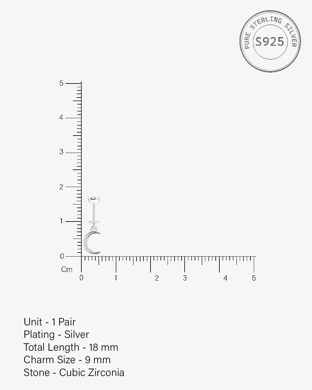 Crescent Moon With Zirconia Helix Hanging Earrings in 92.5 sterling silver with rhodium plating and sparkling 5A+ zirconia stones. The celestial crescent moon design adds mystical elegance and sparkle to helix piercings, perfect for layering or gifting a cosmic-inspired piece.