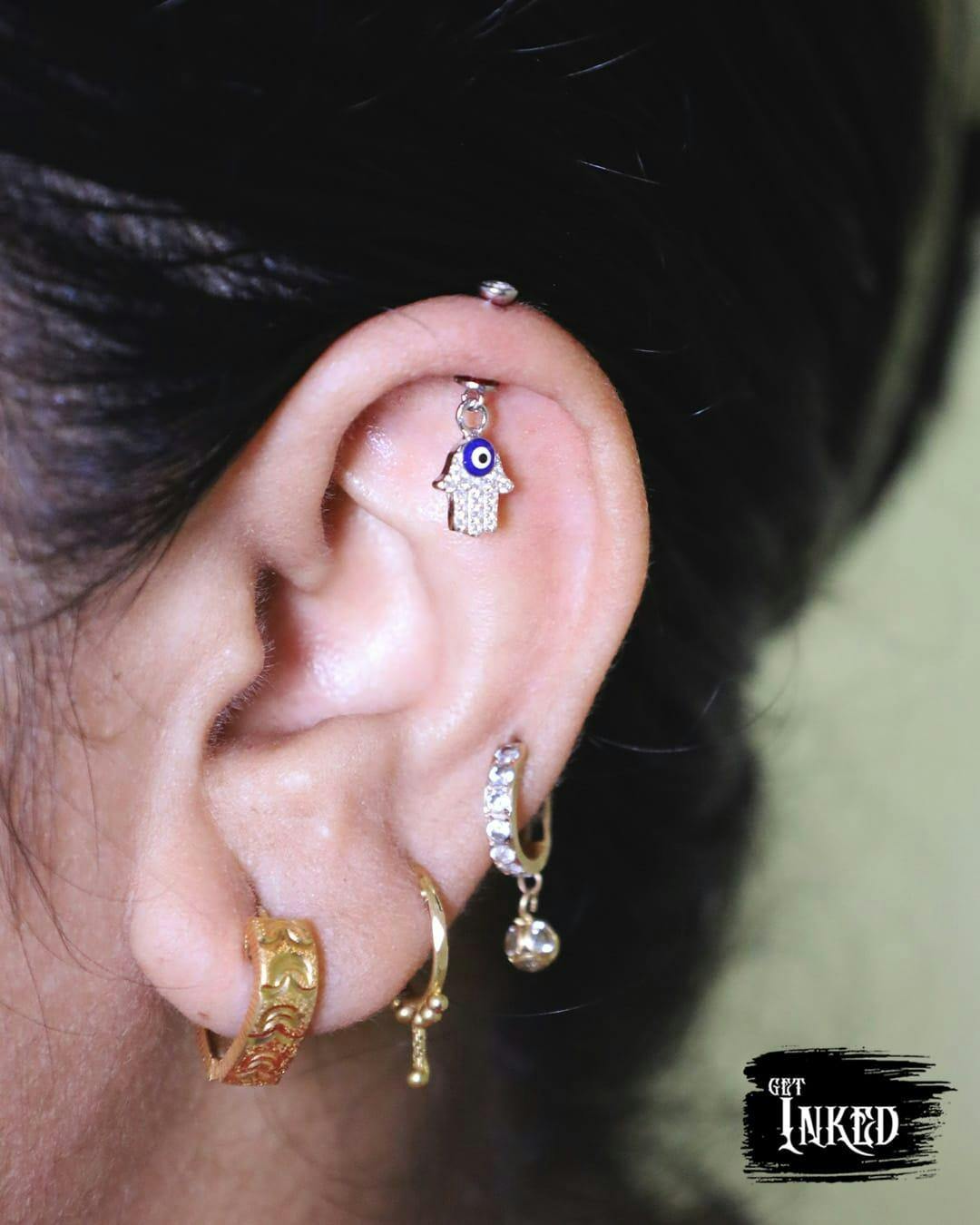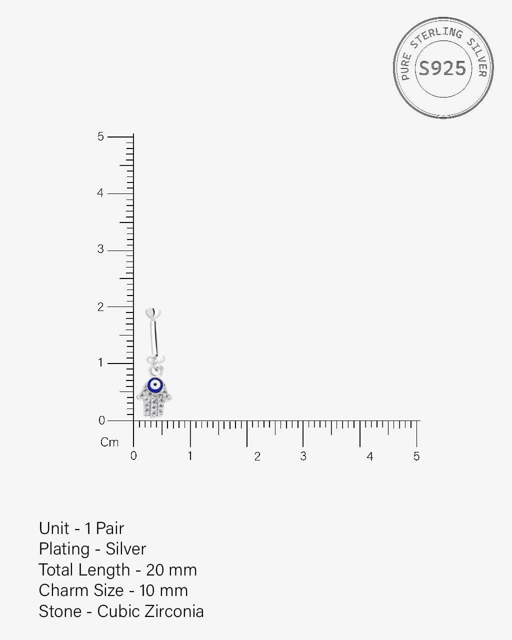 Hamsa Hand Helix Hanging Earrings in 92.5 sterling silver with rhodium plating and 5A+ zirconia stones. The symbolic Hamsa motif adds elegance, protection, and sparkle to helix piercings, ideal for layering, gifting, or enhancing your ear jewelry collection with meaningful style.