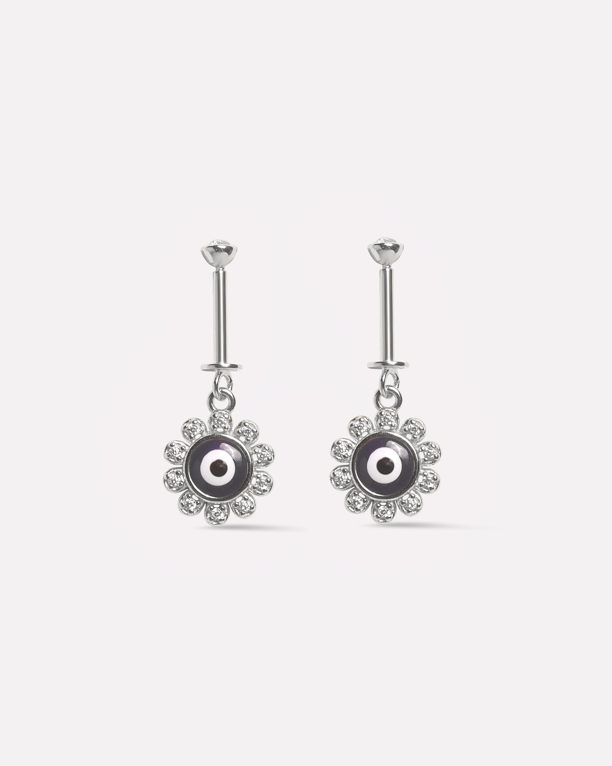 Evil Eye Helix Piercings Hanging Ear Cuff in 92.5 sterling silver, rhodium plated with 5A+ zirconia stones. The sparkling evil eye design with subtle accents enhances helix piercings with mystical elegance, perfect for layering, gifting, or making a bold, protective style statement.
