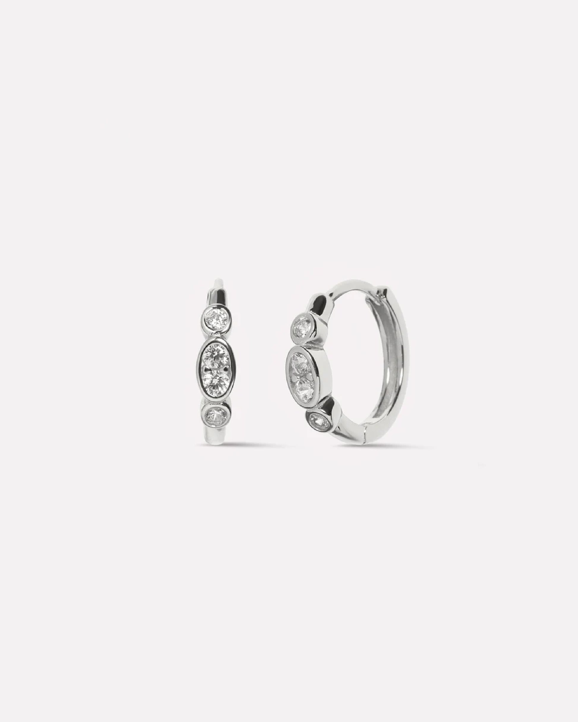 Modern Silique Bazel hoops in 92.5 silver, rhodium plated with 5A+ zirconia stones. The subtle bezel design offers contemporary shine and versatility for everyday or evening wear.