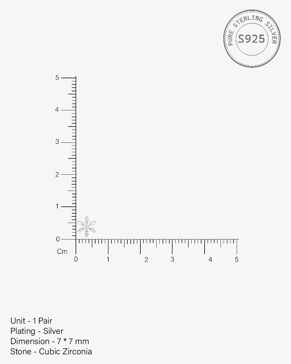 Snowflake Stud Earrings in 92.5 silver with rhodium plating and 5A+ zirconia stones. Intricate snowflake design with sparkling details for elegant winter-inspired or daily wear.