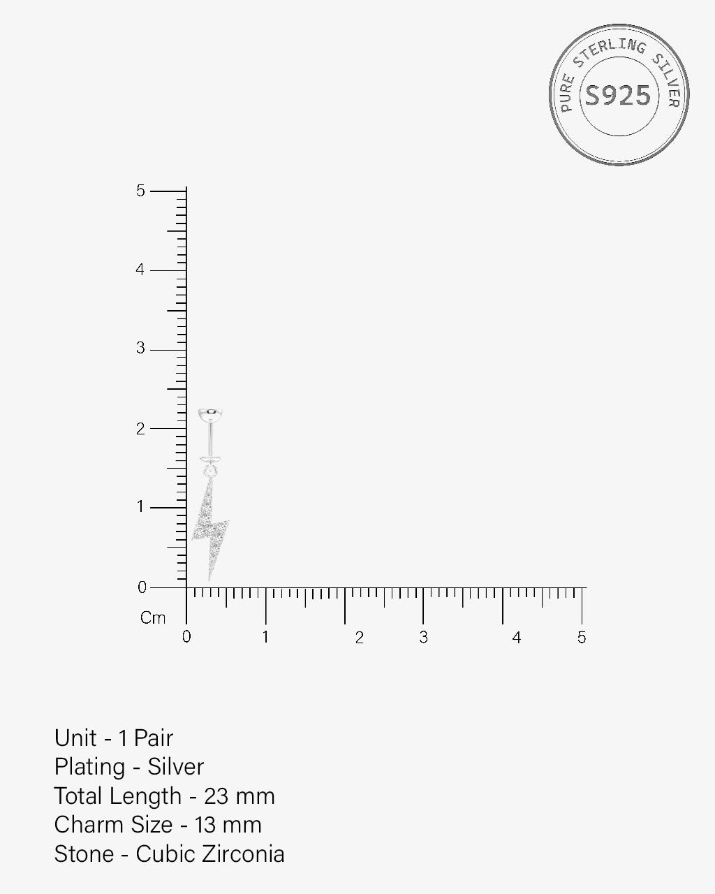 Zircon Studded Thunder Screw Helix Earrings in 92.5 sterling silver with rhodium plating and 5A+ zirconia stones. Lightning motif adorned with sparkling zirconia offers bold elegance, flowing movement, and radiant charm for helix piercings or layered ear jewelry styling.