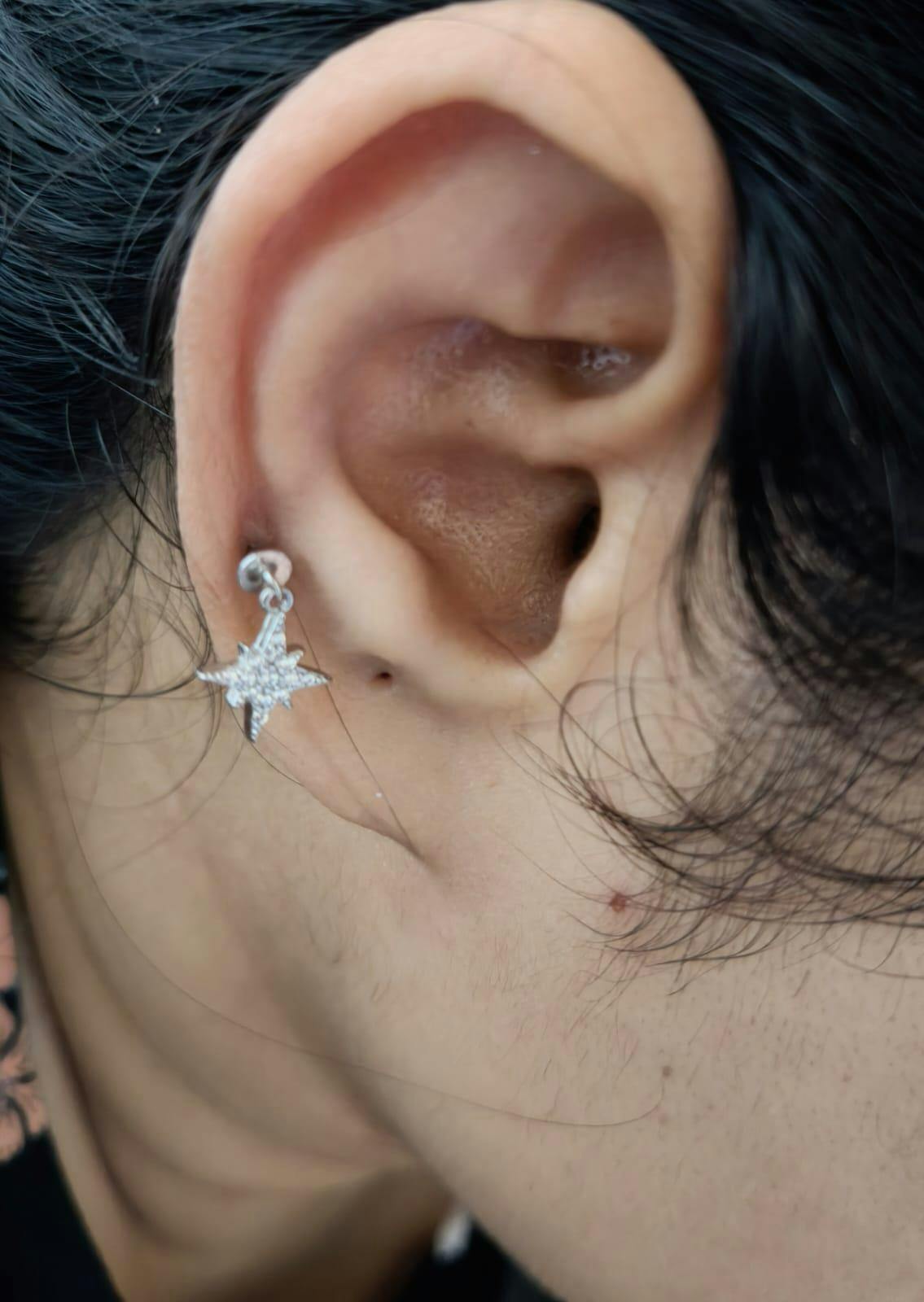Zircon Star Helix Earrings in 92.5 sterling silver with rhodium plating and 5A+ zirconia stones. Sparkling star motif delivers celestial elegance, graceful movement, and radiant shine for helix piercings, adding a chic, layered ear jewelry look.