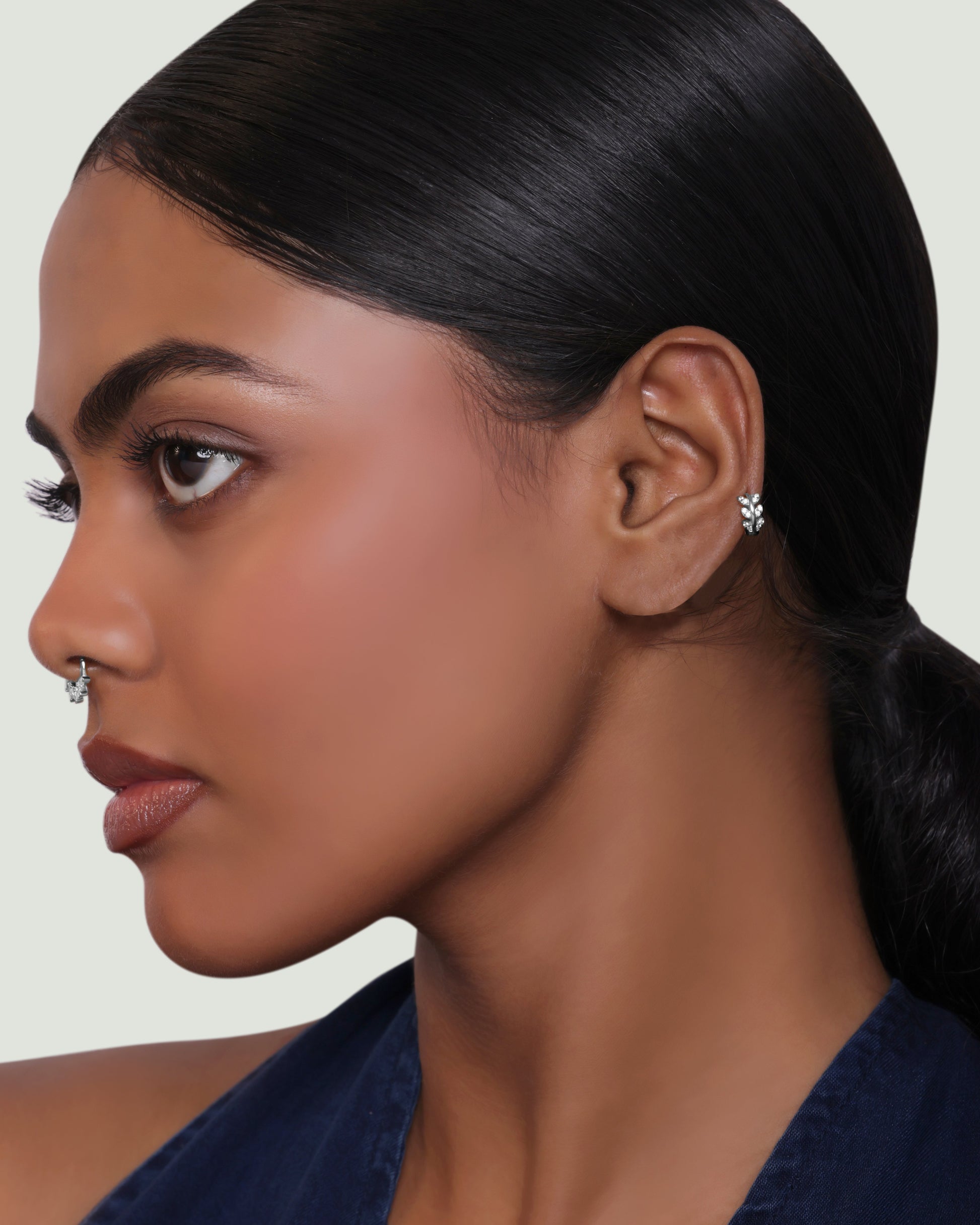 Rhodium-plated Two Size Zirconia Leaf hoops in 92.5 silver with 5A+ zirconia stones. Perfect for creating layered looks, the leaf design provides delicate charm and sparkling sophistication.