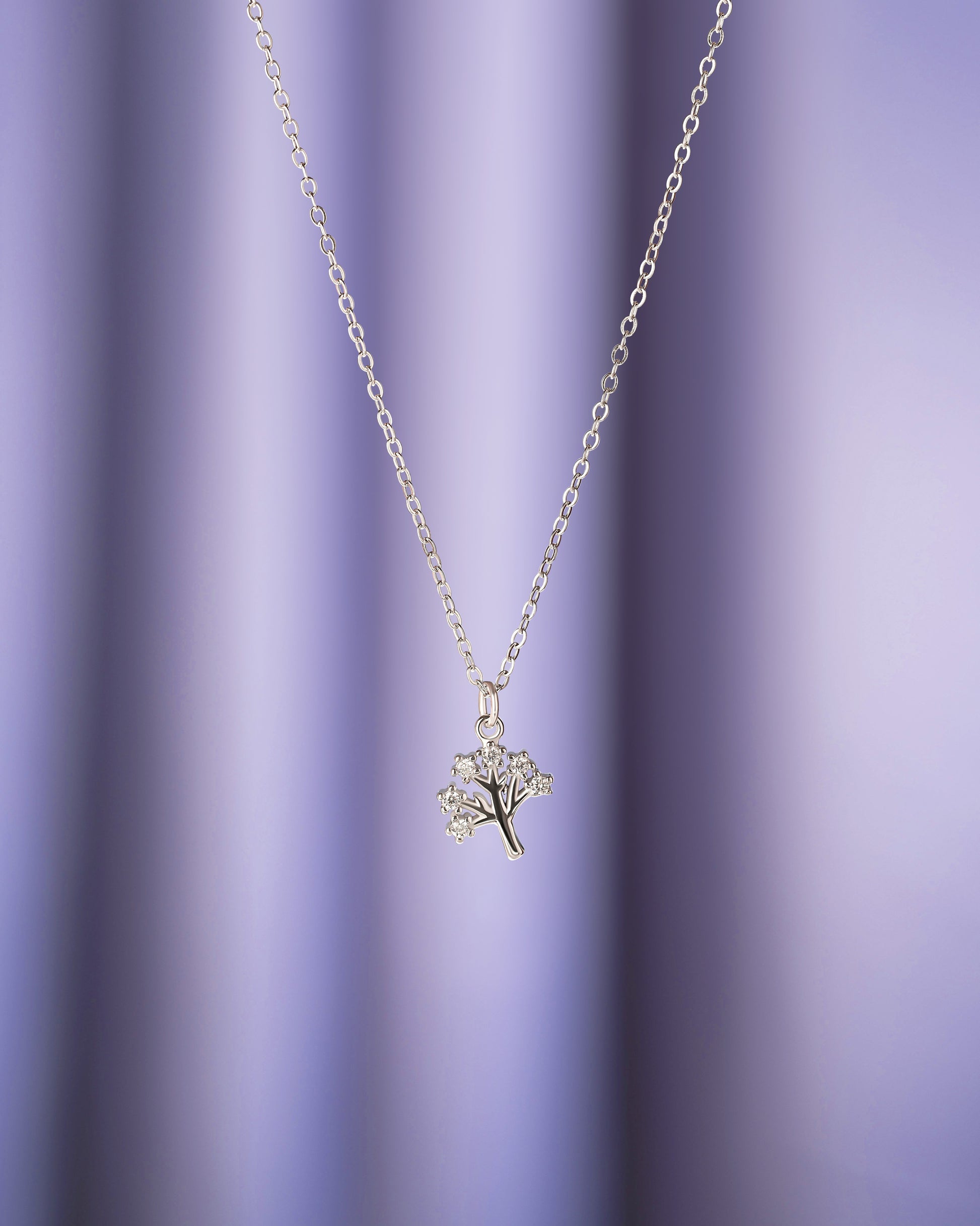 Tree of Life Charm Necklace in 92.5 sterling silver with 5A+ zirconia stones. Rhodium plated for enduring brilliance, this symbolic design celebrates growth, wisdom, and connection, perfect for gifting or layering with everyday jewelry.