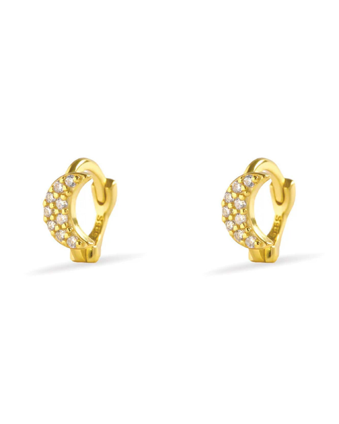Elegant Moon Huggee hoops in 92.5 silver with 14K gold plating, adorned with 5A+ zirconia...