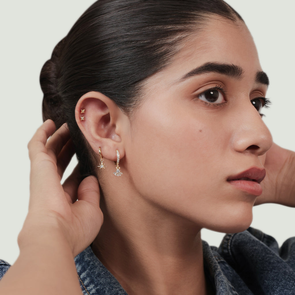 Modern bar charm hoops in 92.5 silver, rhodium plated with 5A+ zirconia stones. Sleek, dangling...