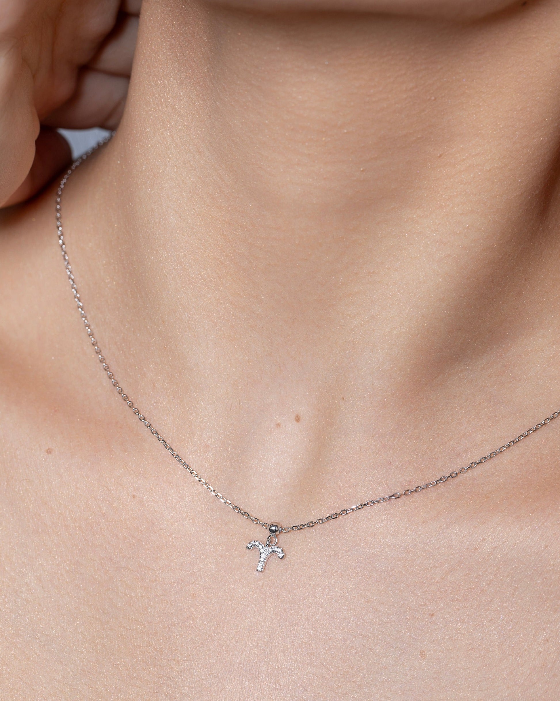 Aries Stone Pavé Zodiac Necklace in 92.5 sterling silver with 5A+ zirconia stones. Rhodium plated for lasting shine, this astrology-inspired piece mirrors Aries’ fiery energy and bold elegance.