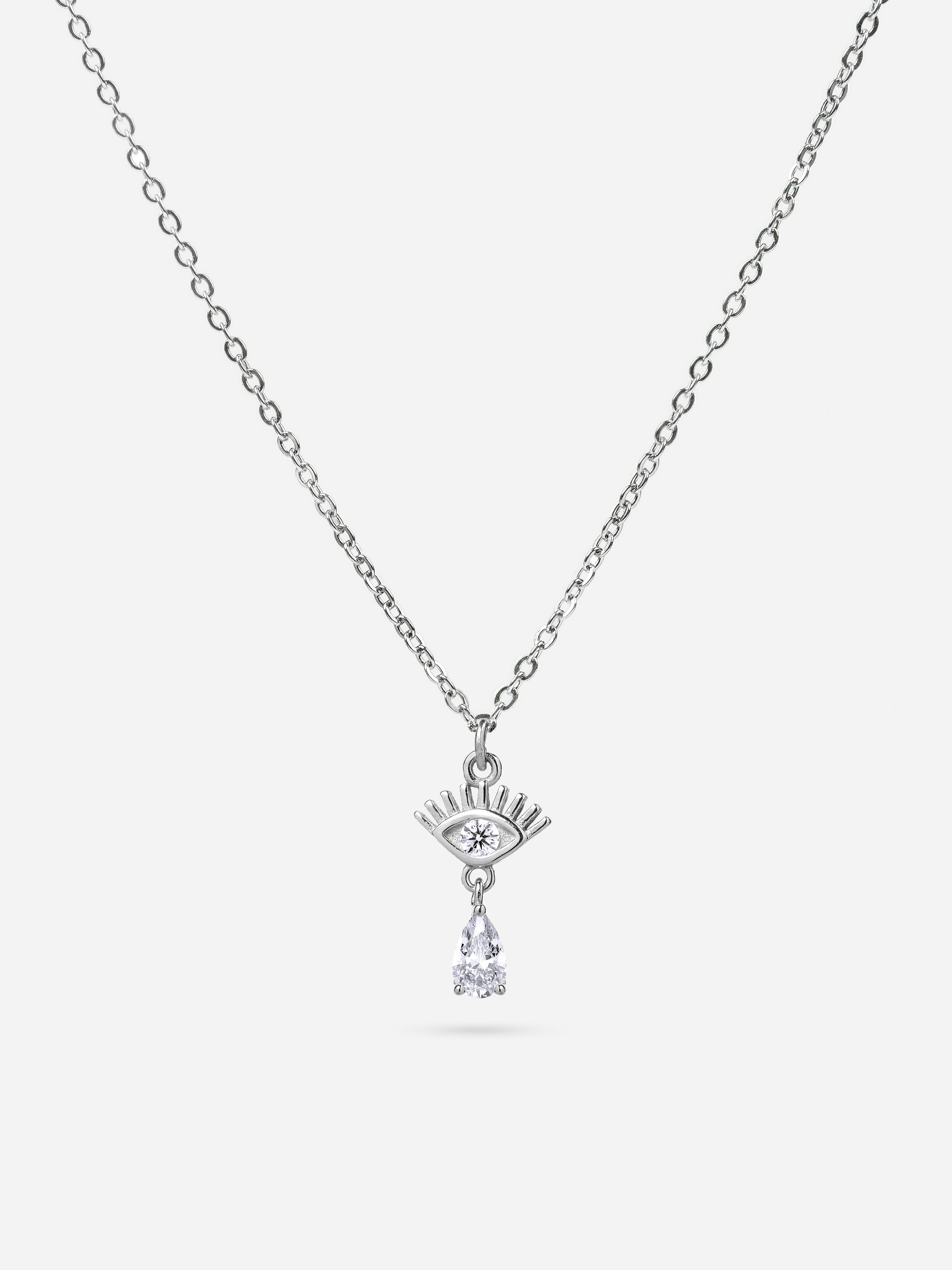Dainty Evil Eye Charm Necklace in 92.5 sterling silver with 5A+ zirconia stones. Rhodium plated for lasting shine, this protective charm adds style and symbolism, ideal for gifting or layering.