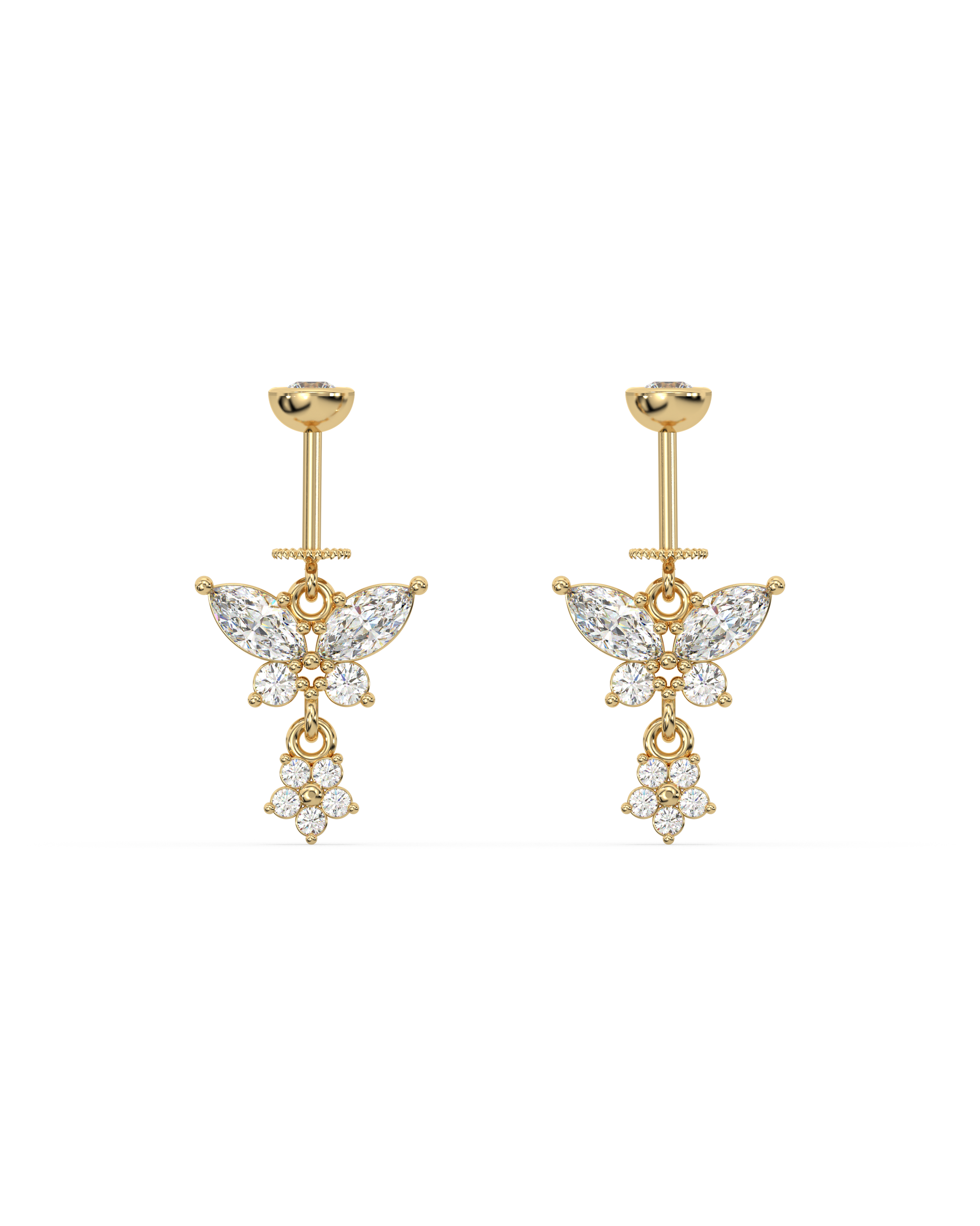 Butterfly Drop Helix Hanging Earrings crafted in 92.5 sterling silver with 5A+ zirconia stones, 14K gold plated. The dangling butterfly motif exudes elegance and femininity, perfect for helix piercings, layering with other earrings, or gifting for a sophisticated, sparkling look.