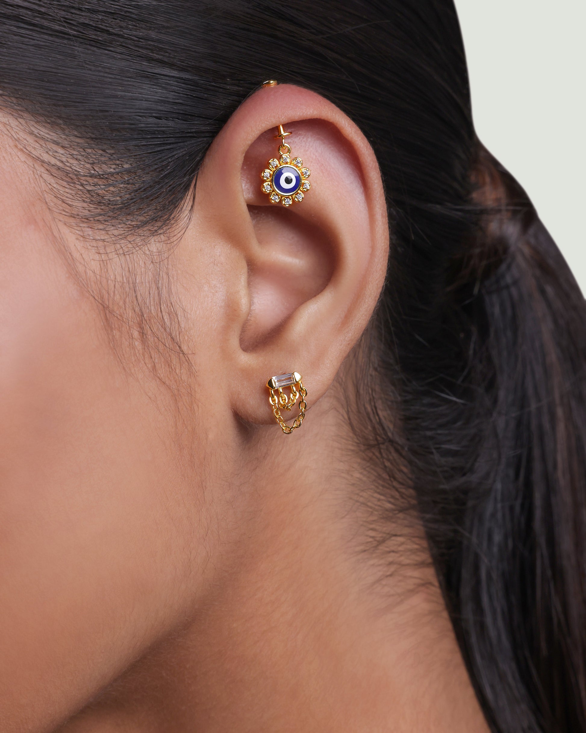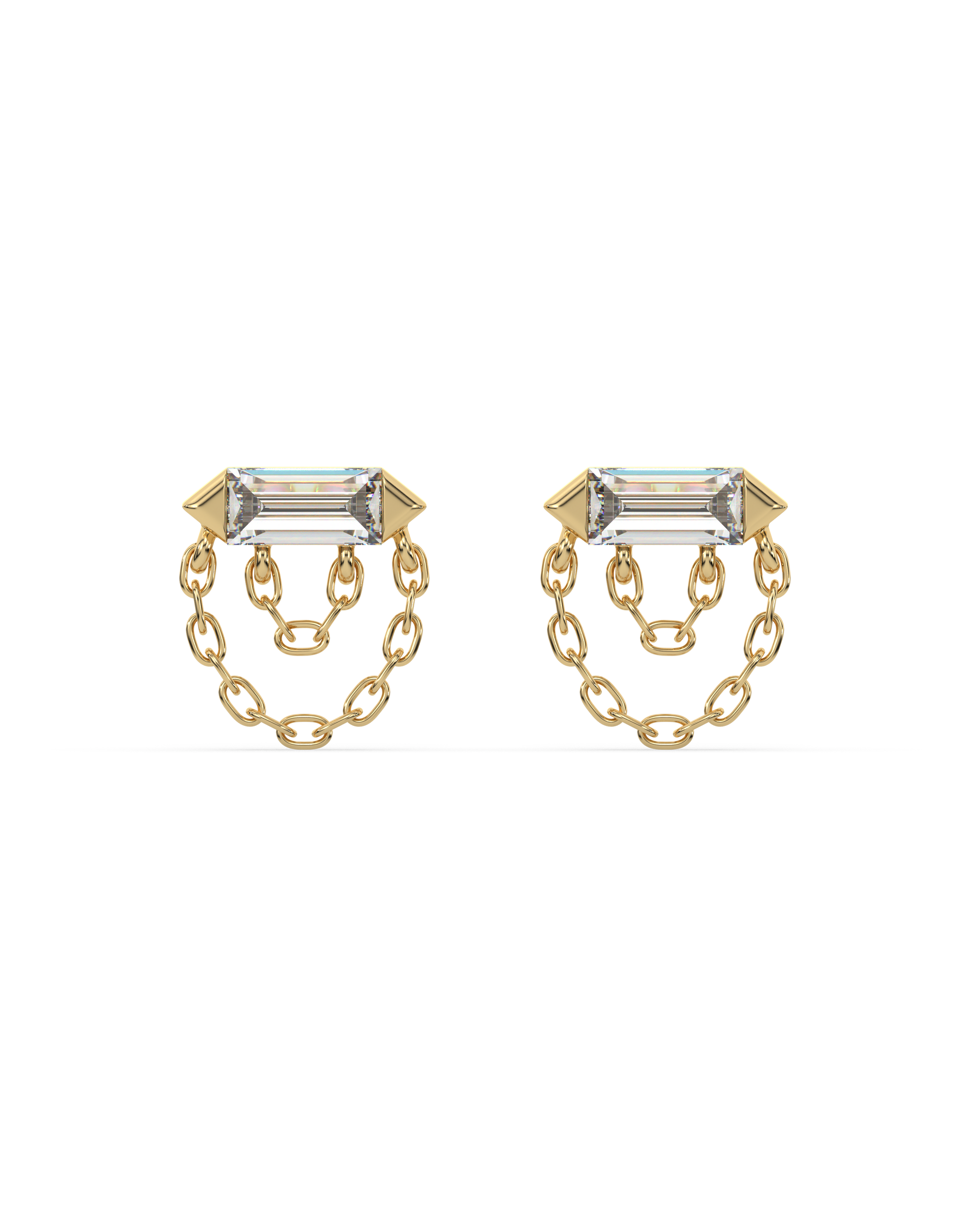 Shine in Double Chain Baguette Stud Earrings crafted in 92.5 silver, set with 5A+ zirconia stones, and plated in 14K gold. The delicate chain design adds graceful movement, making this piece chic, versatile, and elegant.