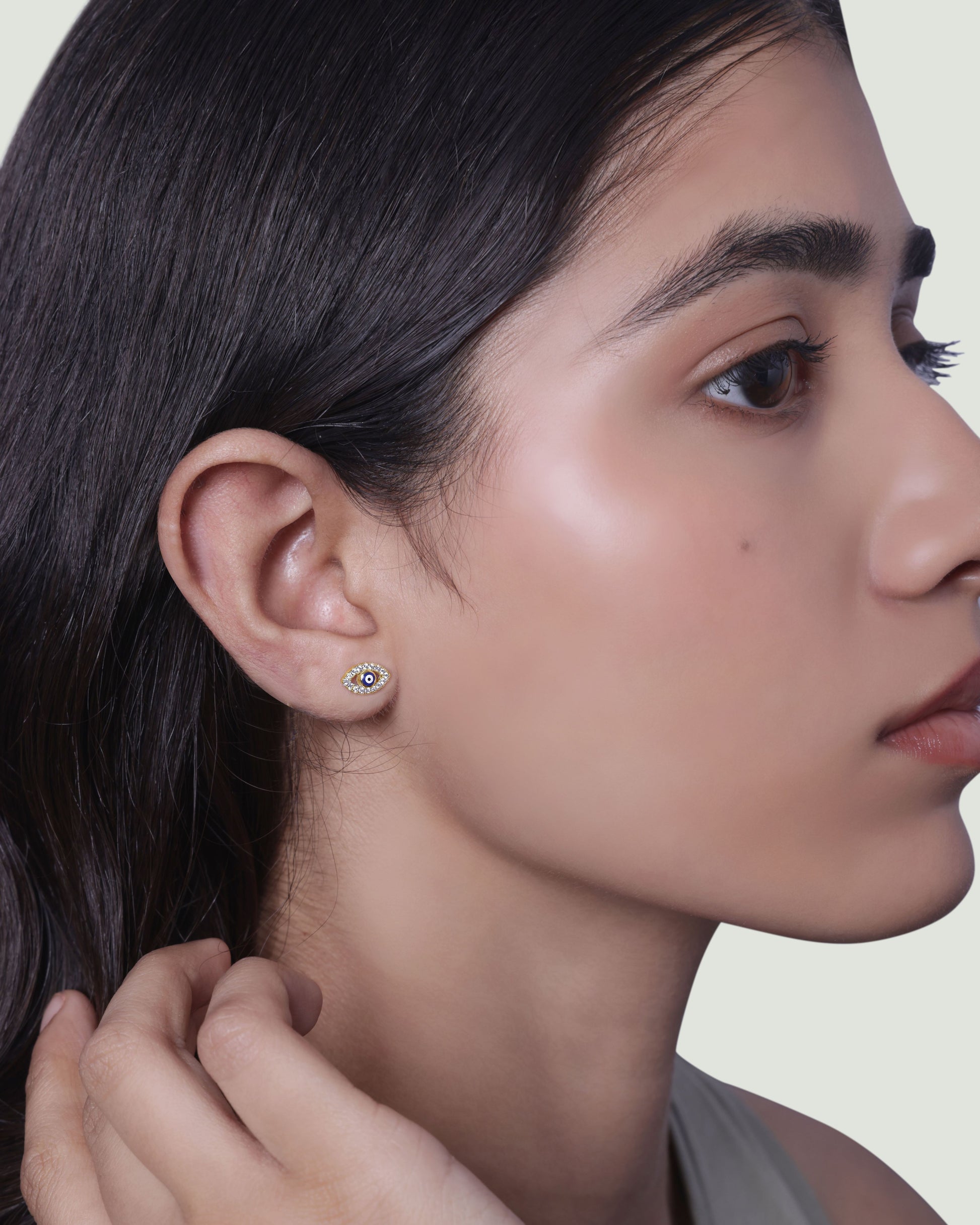 Add a touch of symbolism with Enamel Evil Eye Stud Earrings in 92.5 silver, 5A+ zirconia stones, and 14K gold plating. This protective yet stylish design blends meaning with sparkle for elegant everyday wear.