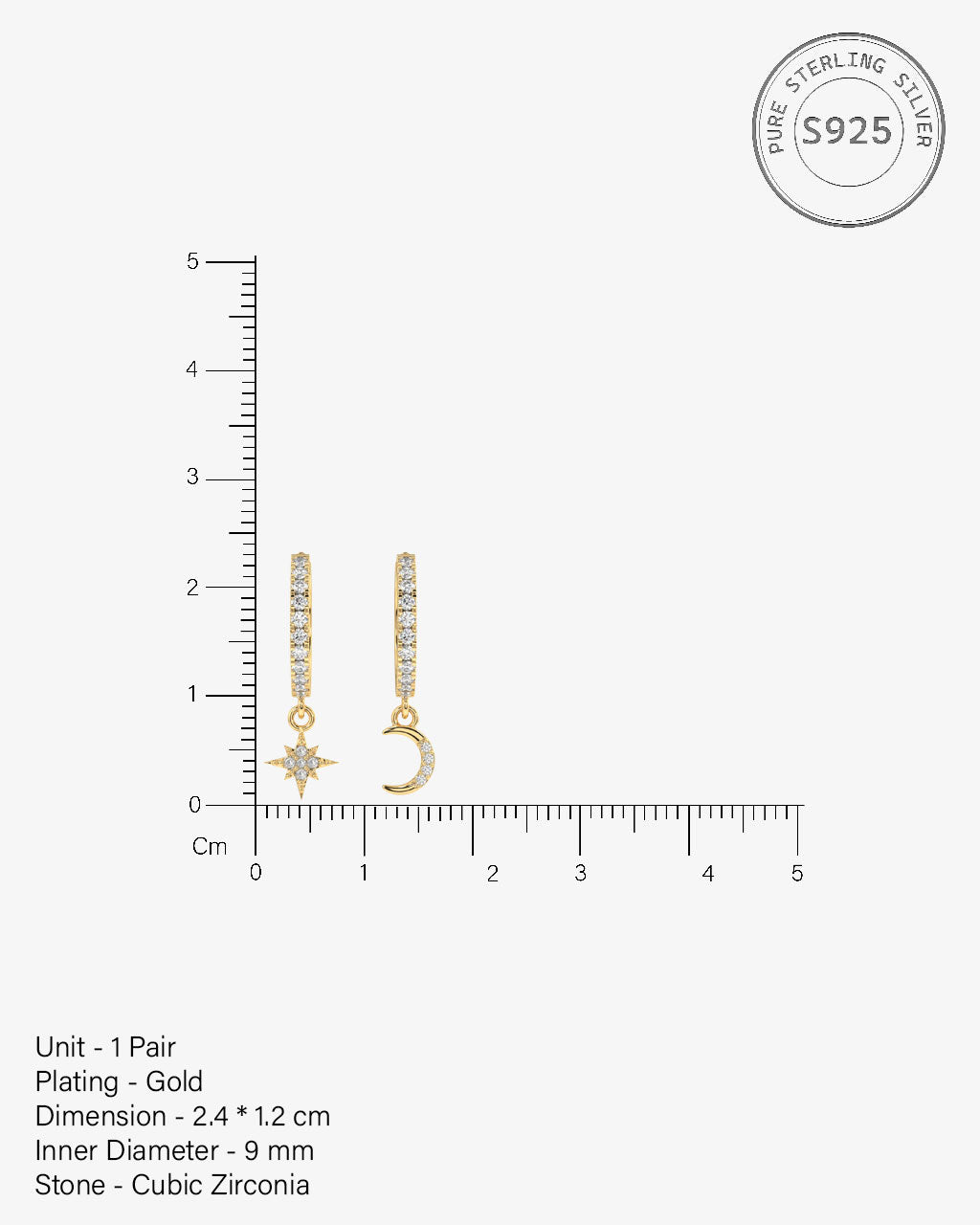 Elegant Moon Star Charm hoops in 92.5 silver with 14K gold plating, adorned with 5A+ zirconia stones. The celestial design adds sparkle and charm, ideal for stacking, layering, or wearing solo for a radiant statement.