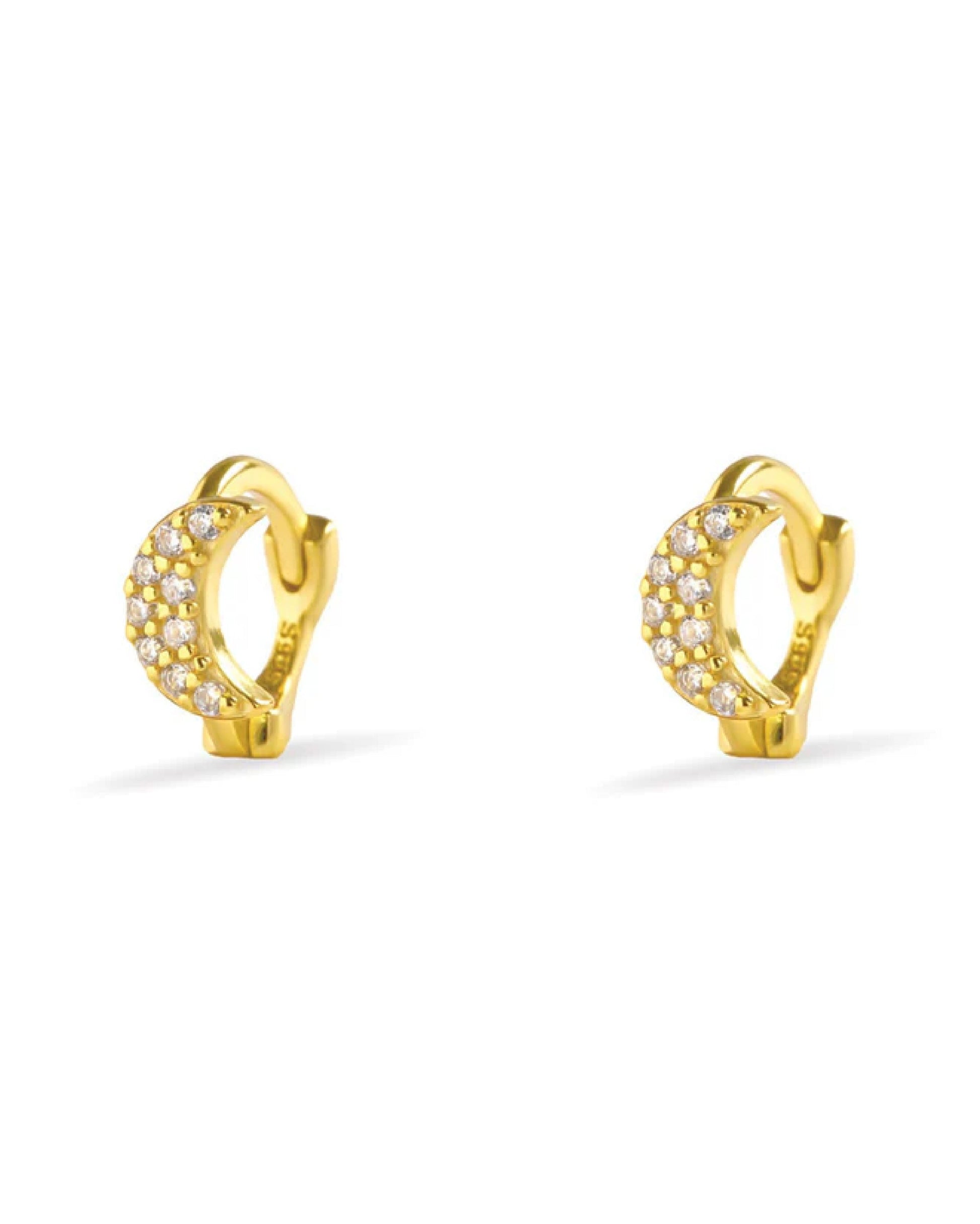 Elegant Moon Huggee hoops in 92.5 silver with 14K gold plating, adorned with 5A+ zirconia stones. The crescent moon design adds sparkle and celestial elegance, ideal for stacking, layering, or wearing solo.