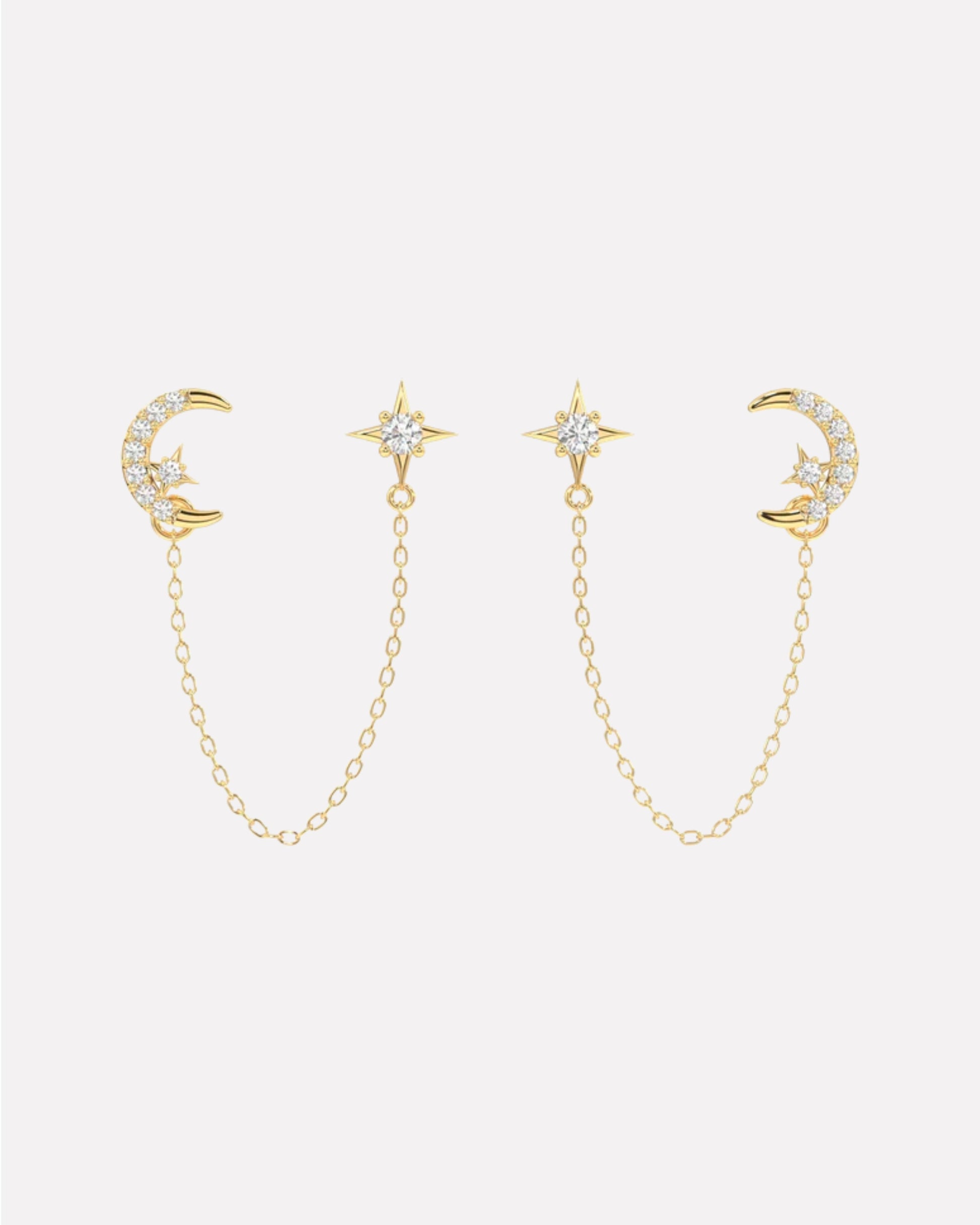 Moon Star 3-In Connector Chain Earrings in 92.5 sterling silver with 5A+ zirconia stones, 14K gold plated. Celestial-inspired chain design with moon and star charms adds sparkle and charm, ideal for gifting or layering.