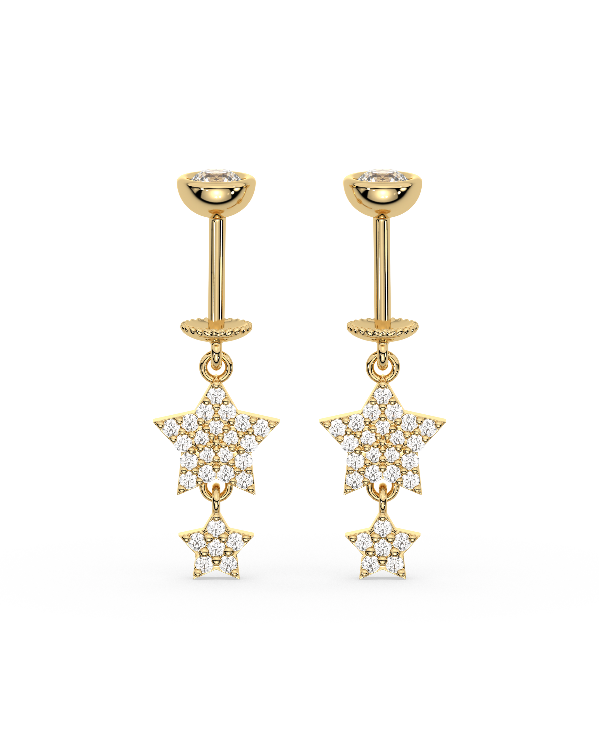 Zirconia Star Droplets Helix Earrings in 92.5 sterling silver, 14K gold plated with 5A+ zirconia stones. Star-shaped droplets glimmer with each movement, offering celestial charm, delicate sparkle, and elegant sophistication for helix piercings or curated layered ear jewelry looks.