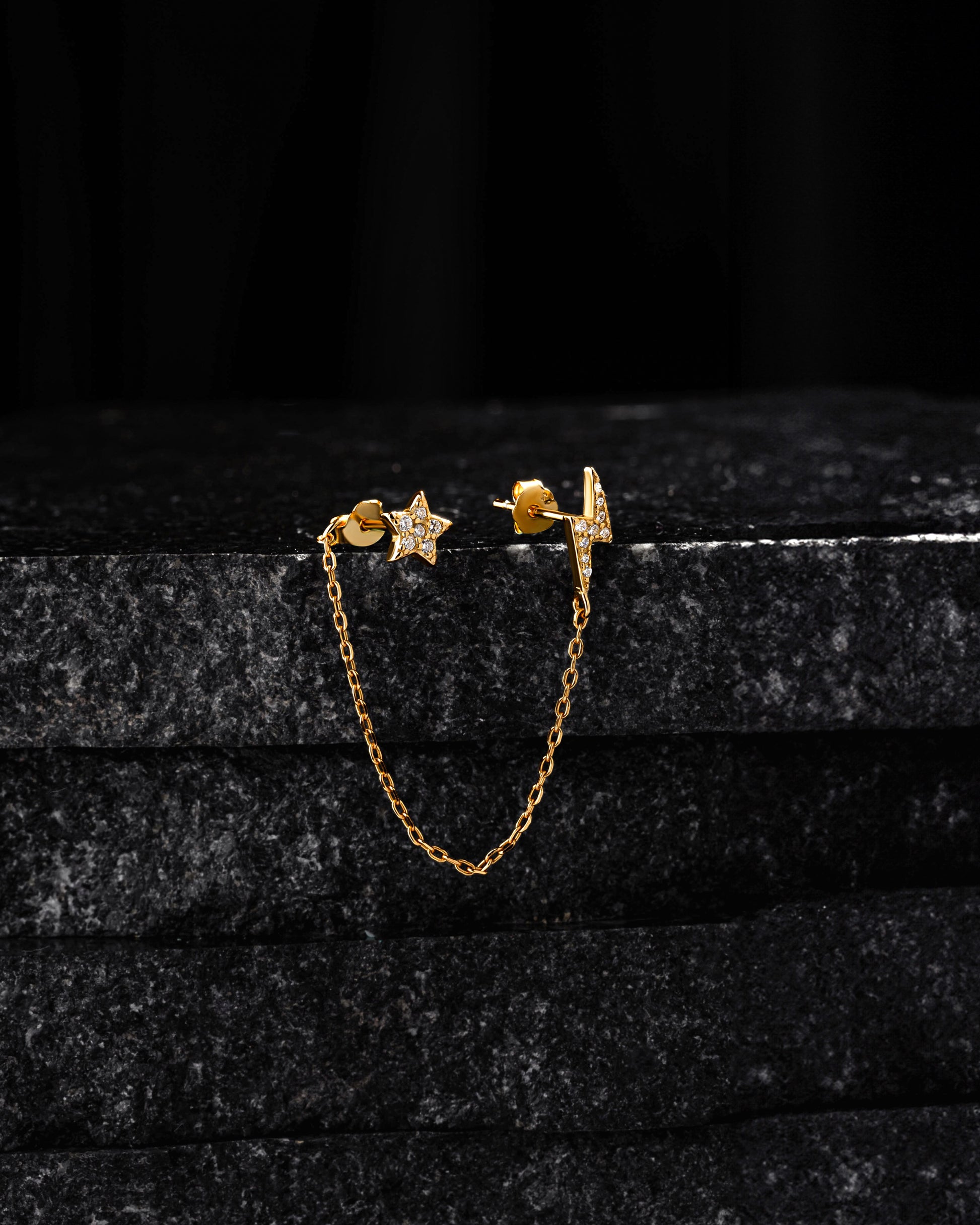 Star And Thunder Connector Stud Chain Earrings in 92.5 sterling silver with 5A+ zirconia stones, 14K gold plated. Celestial-inspired design with stars and thunder motifs adds elegance, ideal for gifting or layering.