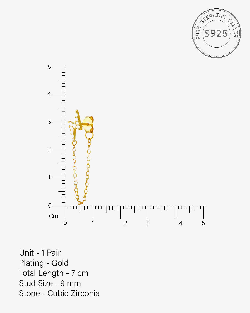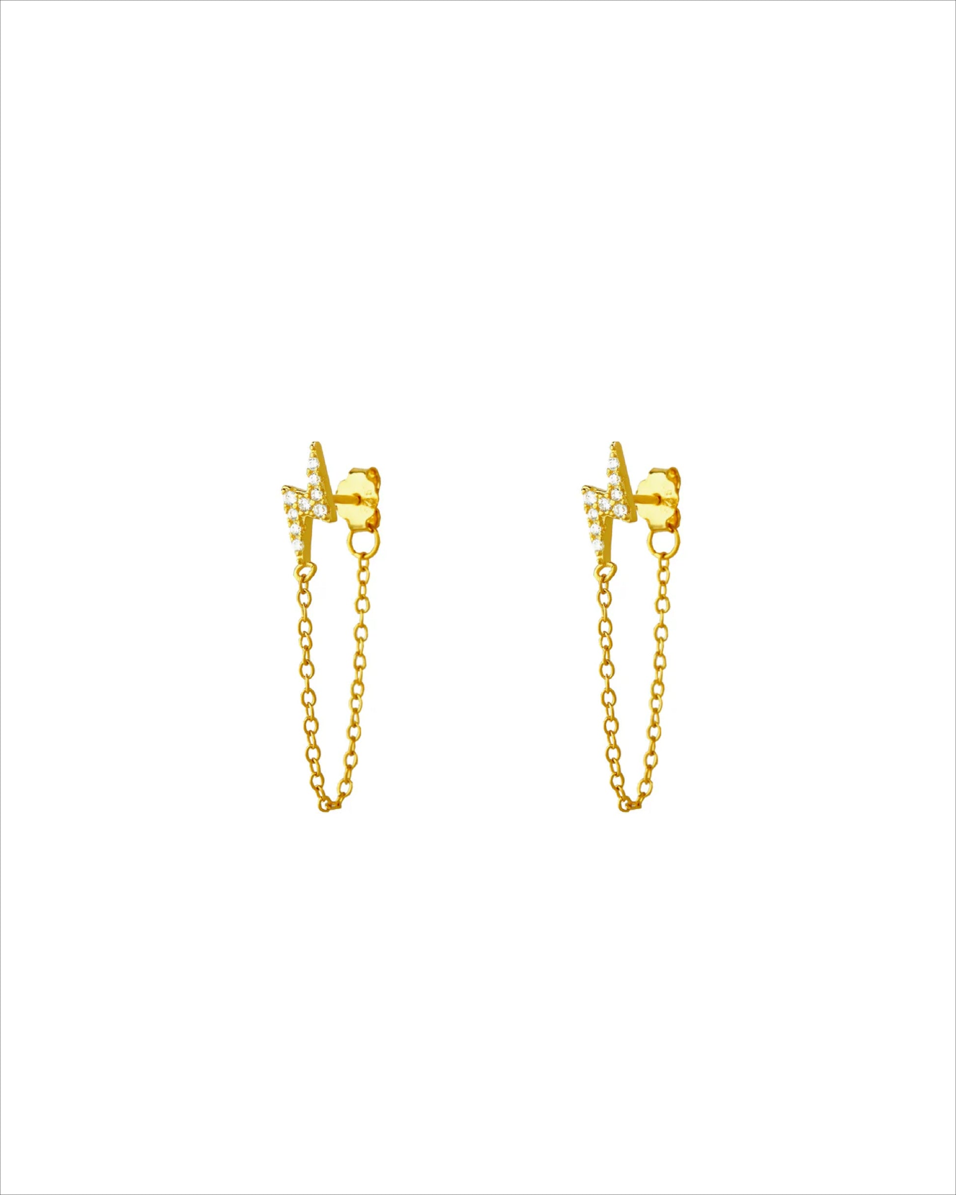 Thunder Dangler Chain Earrings in 92.5 sterling silver with 5A+ zirconia stones, 14K gold plated. Dazzling thunder-inspired dangling chain design adds sparkle and sophistication, ideal for gifting or elevating any outfit.