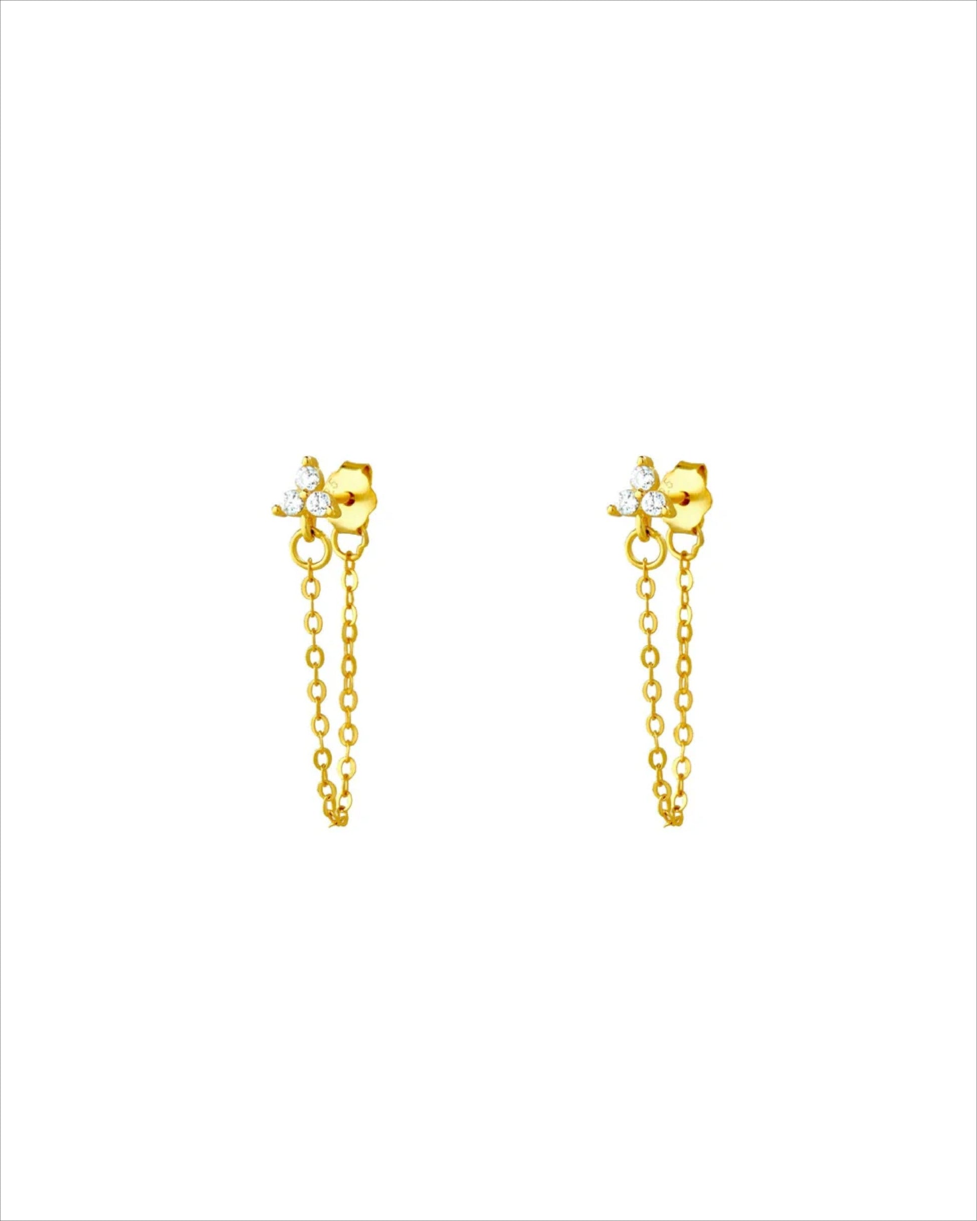 Tri Flower Dangler Chain Earrings in 92.5 sterling silver with 5A+ zirconia stones, 14K gold plated. Three layered floral charms on a dangling chain add charm and sparkle, ideal for gifting or everyday elegance.