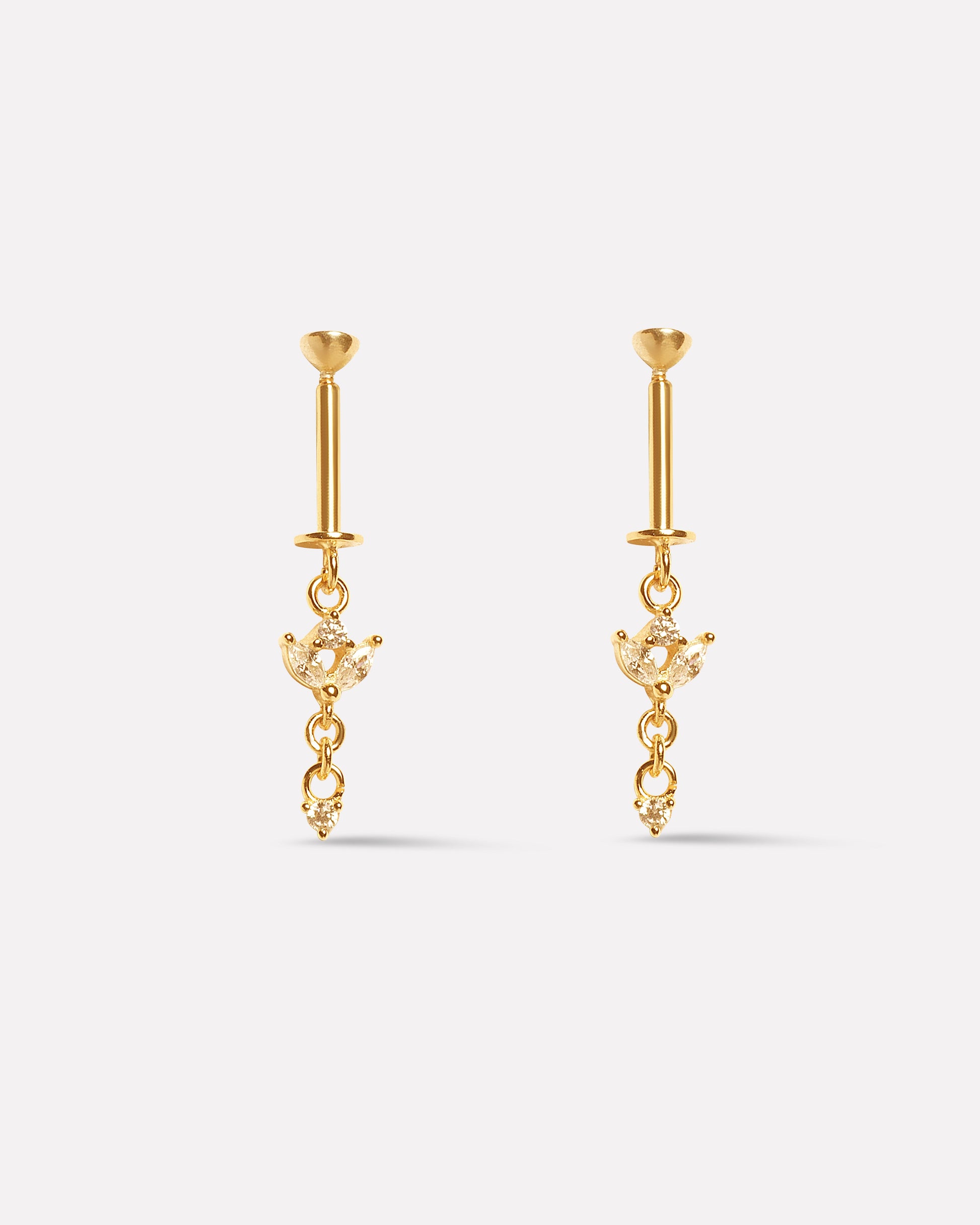 Two Petal Drop Helix Earrings in 92.5 sterling silver, 14K gold plated with 5A+ zirconia stones. Features dual petal-inspired drops that shimmer with elegance, offering delicate movement, luminous sparkle, and refined charm for helix piercings or a stylish layered ear jewelry look.