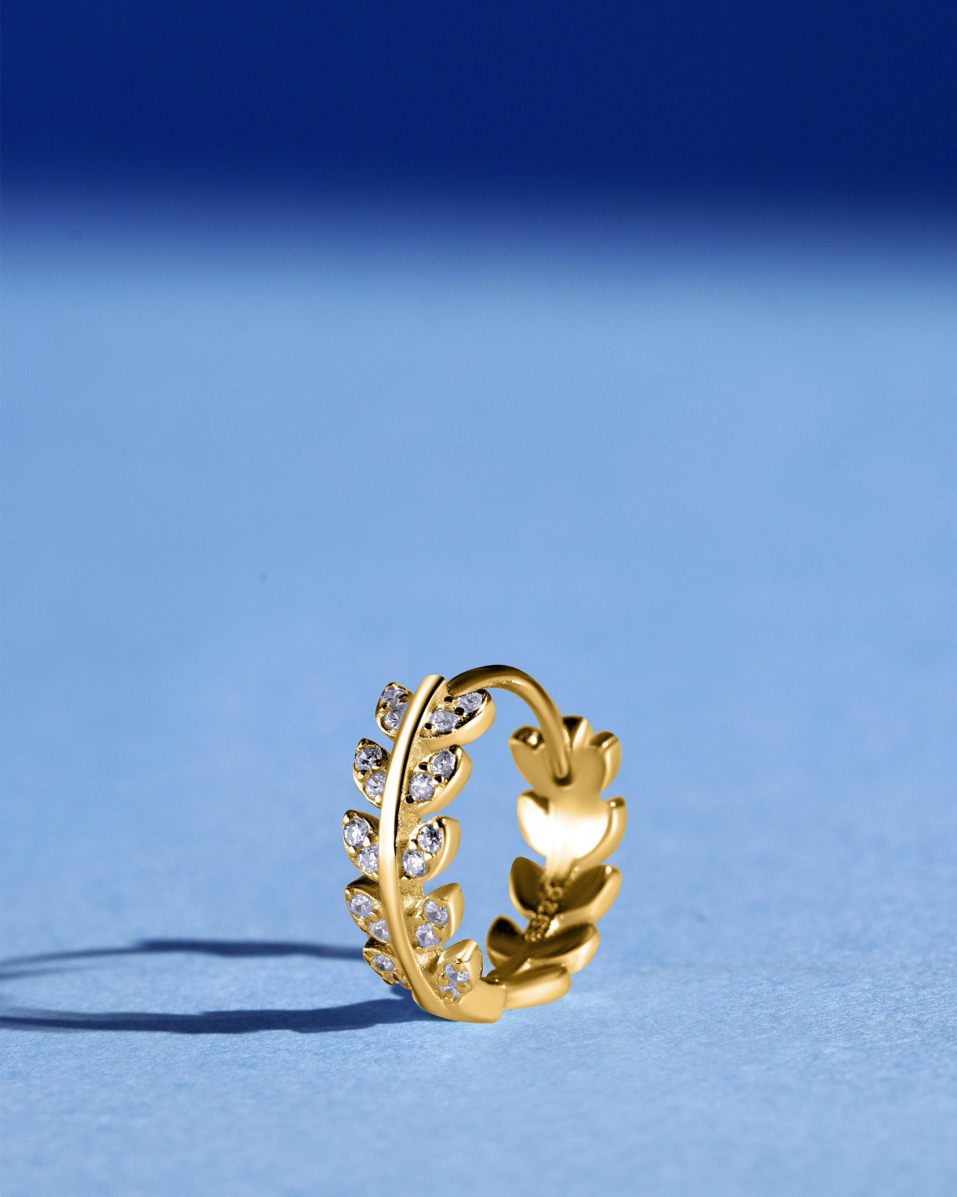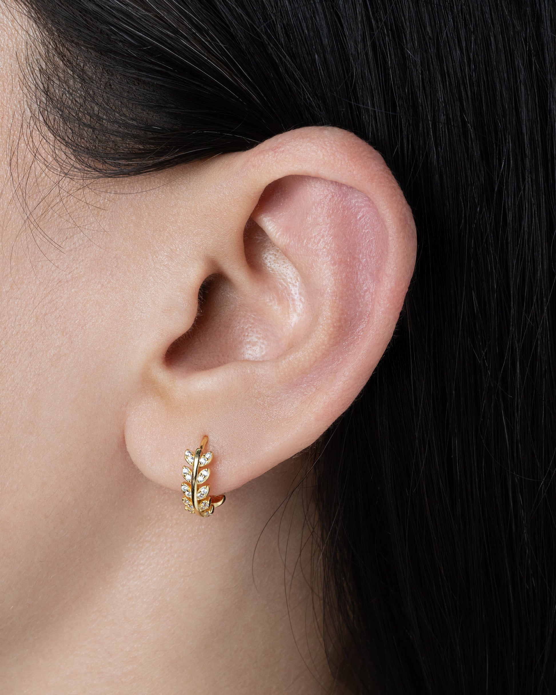 Versatile Multiple Sizes Zirconia Leaf hoops in 92.5 silver, 14K gold plated and adorned with 5A+ zirconia stones. A nature-inspired design that adds graceful sparkle to layered or standalone styling.