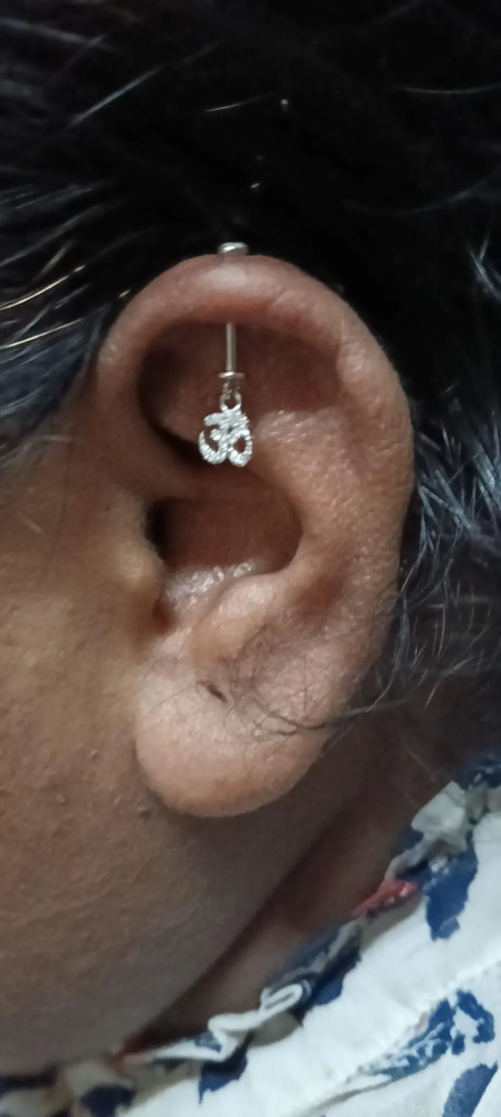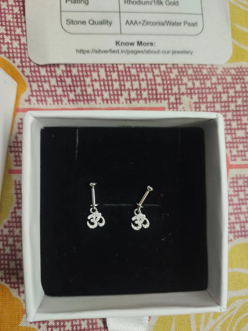Aum Om Fine Screw Helix Hanging Earrings in 92.5 sterling silver with brilliant 5A+ zirconia stones. Rhodium plated for long-lasting shine, the spiritual Om design combines elegance and symbolism, making it a meaningful addition to your helix piercings or jewelry collection.
