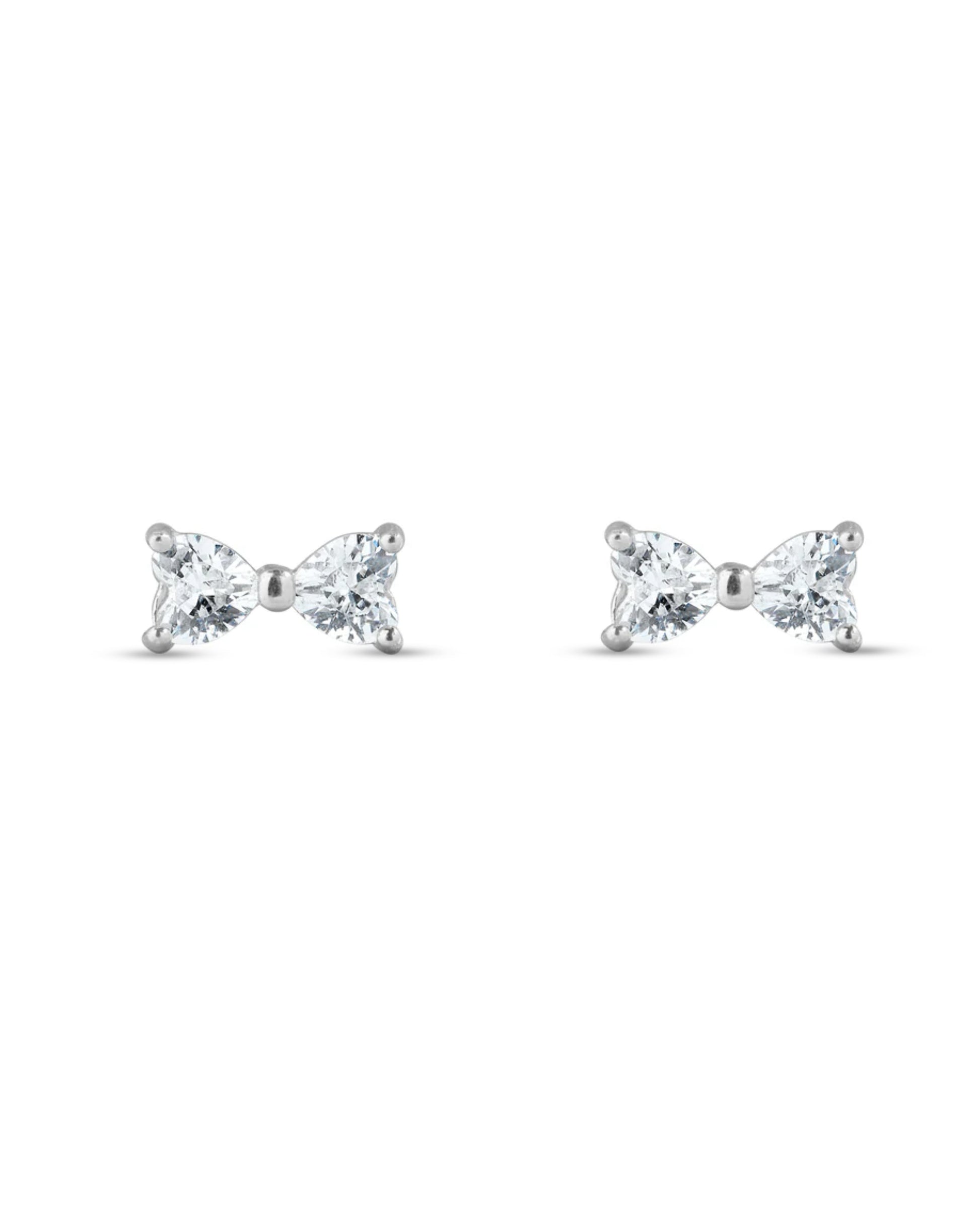Minimal Two Stone Bow Stud Earrings in 92.5 silver with rhodium plating and 5A+ zirconia stones. A delicate bow silhouette with two sparkling stones, symbolizing grace and charm for daily wear.