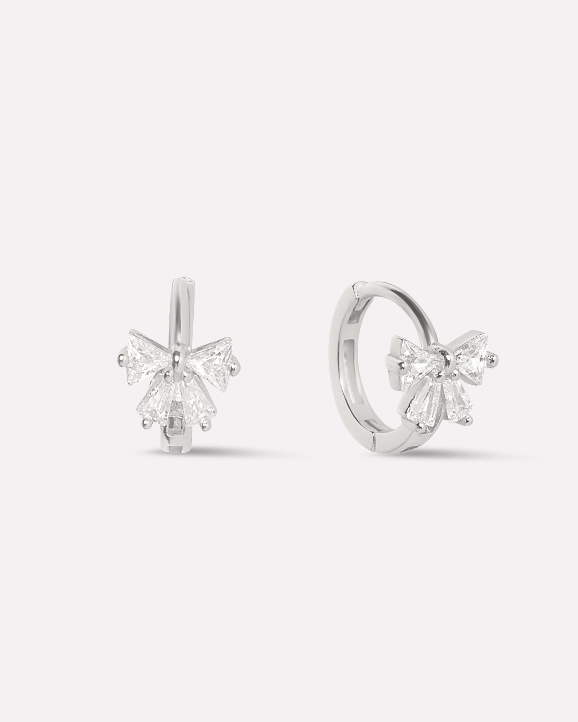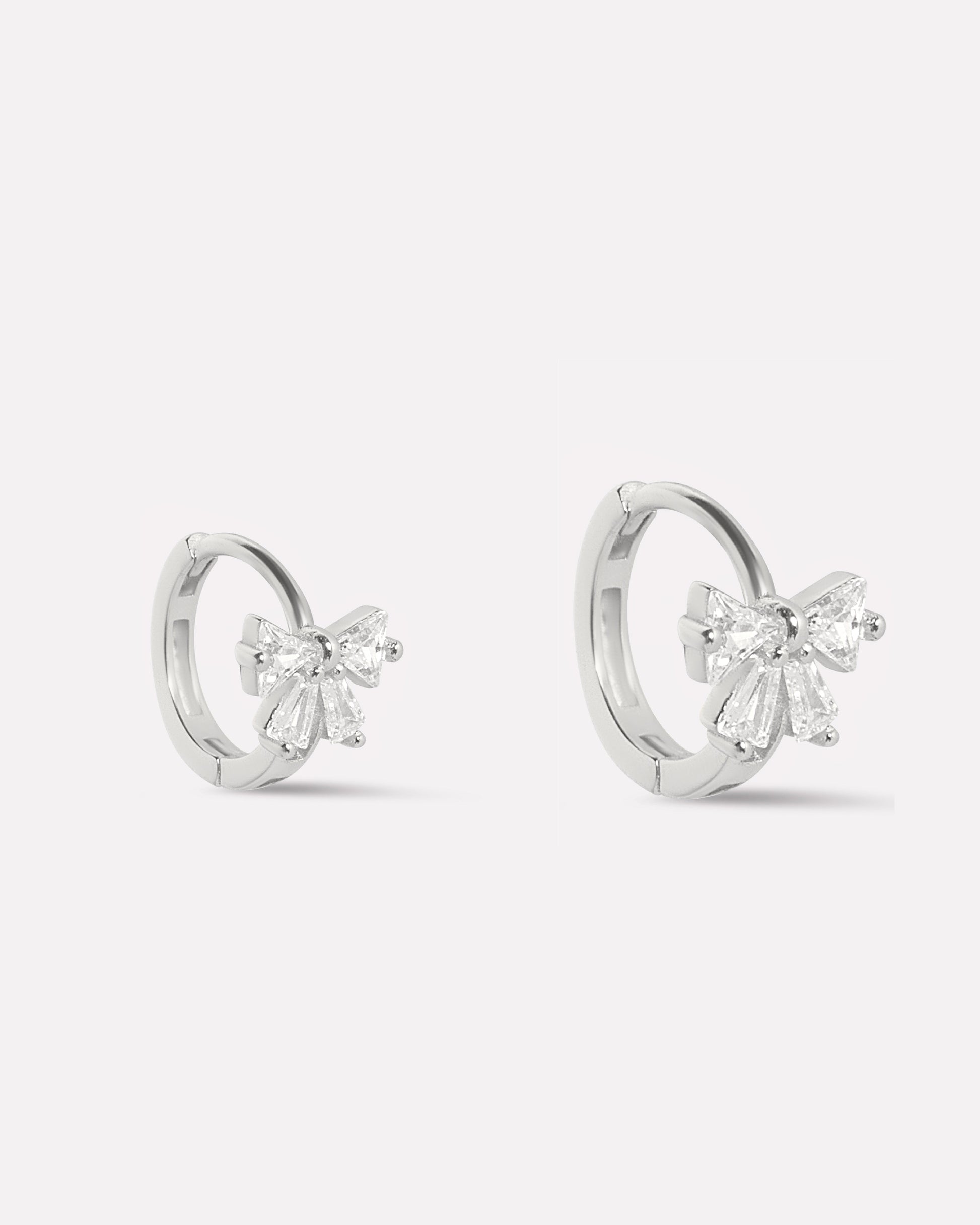 Delicate Bow Tie Dainty hoops in 92.5 silver, rhodium plated with sparkling 5A+ zirconia stones. Featuring a cute bow design, these hoops offer playful yet sophisticated sparkle, ideal for layering, gifting, or adding a touch of elegance to daily wear.