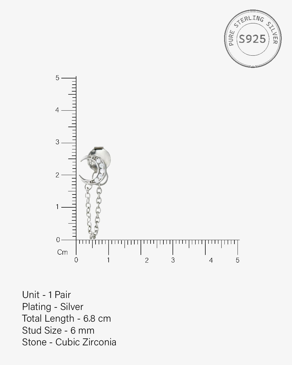 Crescent Moon Chain Earrings in 92.5 sterling silver with 5A+ zirconia stones. Rhodium plated for lasting brilliance, these celestial-inspired chain earrings feature crescent moon charms, perfect for layering, everyday wear, or gifting.