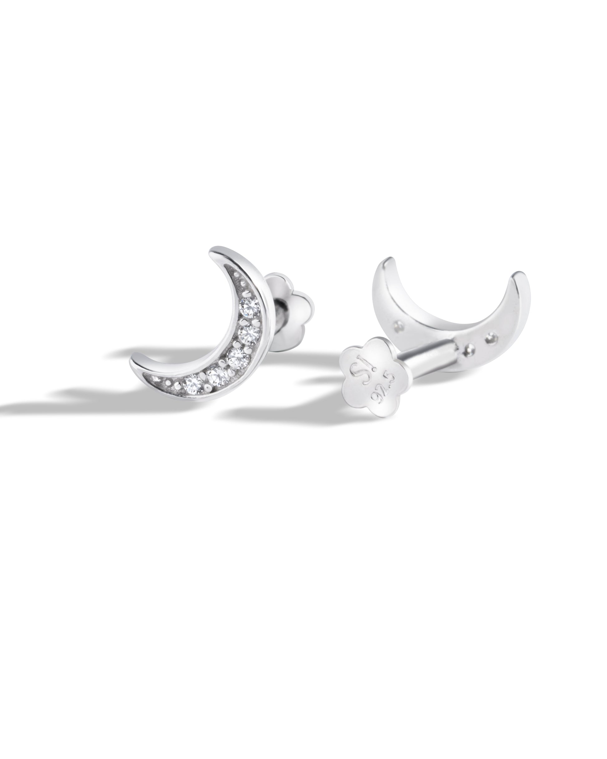 Crescent Moon Flat Back Screw Stud Earrings in 92.5 sterling silver with 5A+ zirconia stones. Rhodium plated, featuring a delicate crescent moon design for celestial elegance, perfect for gifting or daily wear.