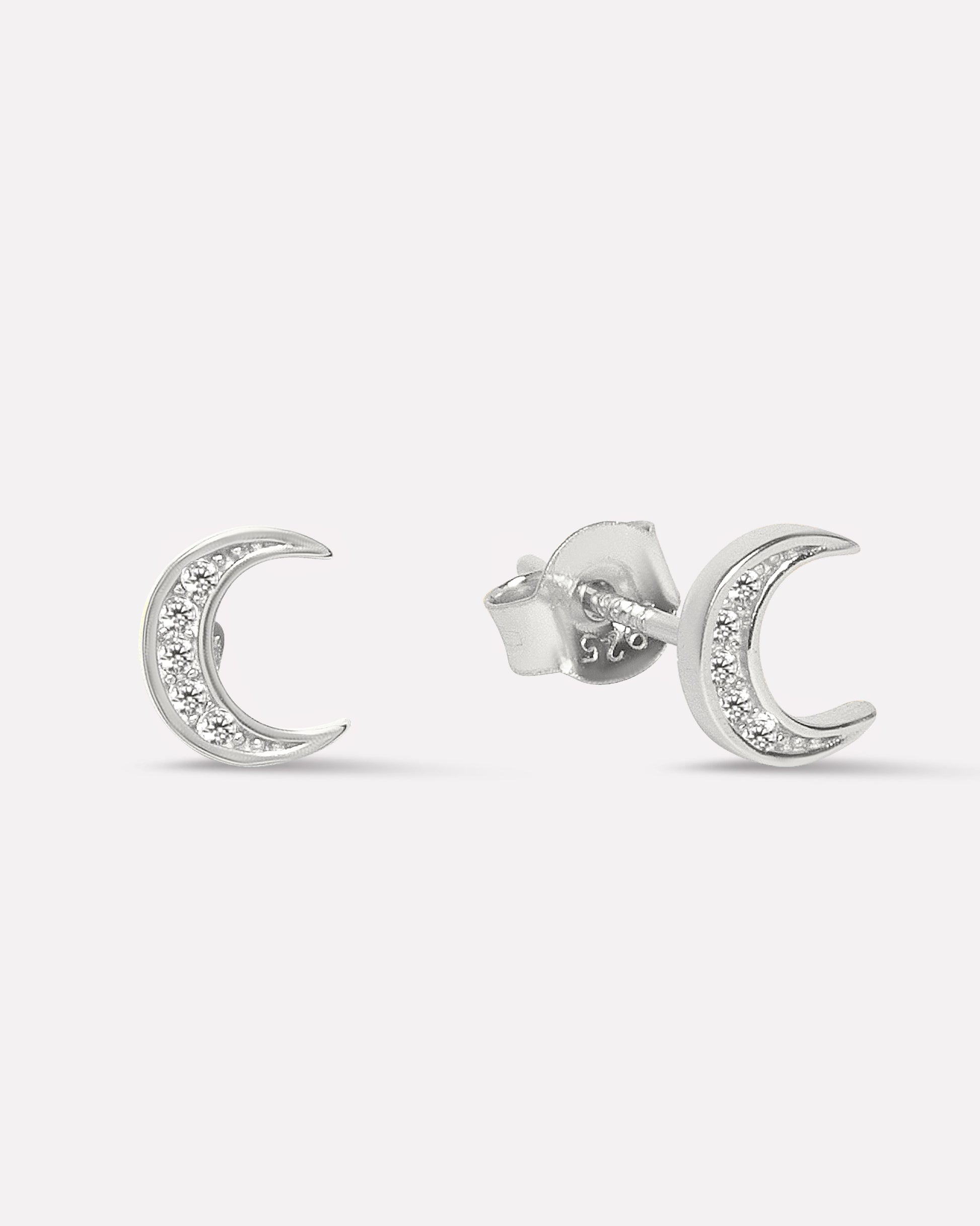 Crescent Moon Zirconia Stud Earrings in 92.5 silver with rhodium plating. Subtle celestial charm with sparkling stones, perfect for daily wear or gifting.