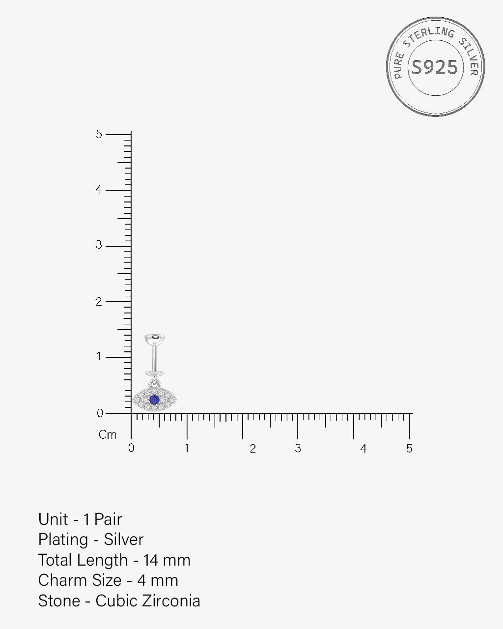 Zirconia Small Evil Eye Helix Earrings in 92.5 sterling silver with rhodium plating and 5A+ zirconia stones. Petite evil eye motif adorned with zirconia sparkles subtly, offering mystical charm, graceful movement, and elegant refinement for helix piercings or layered styling.