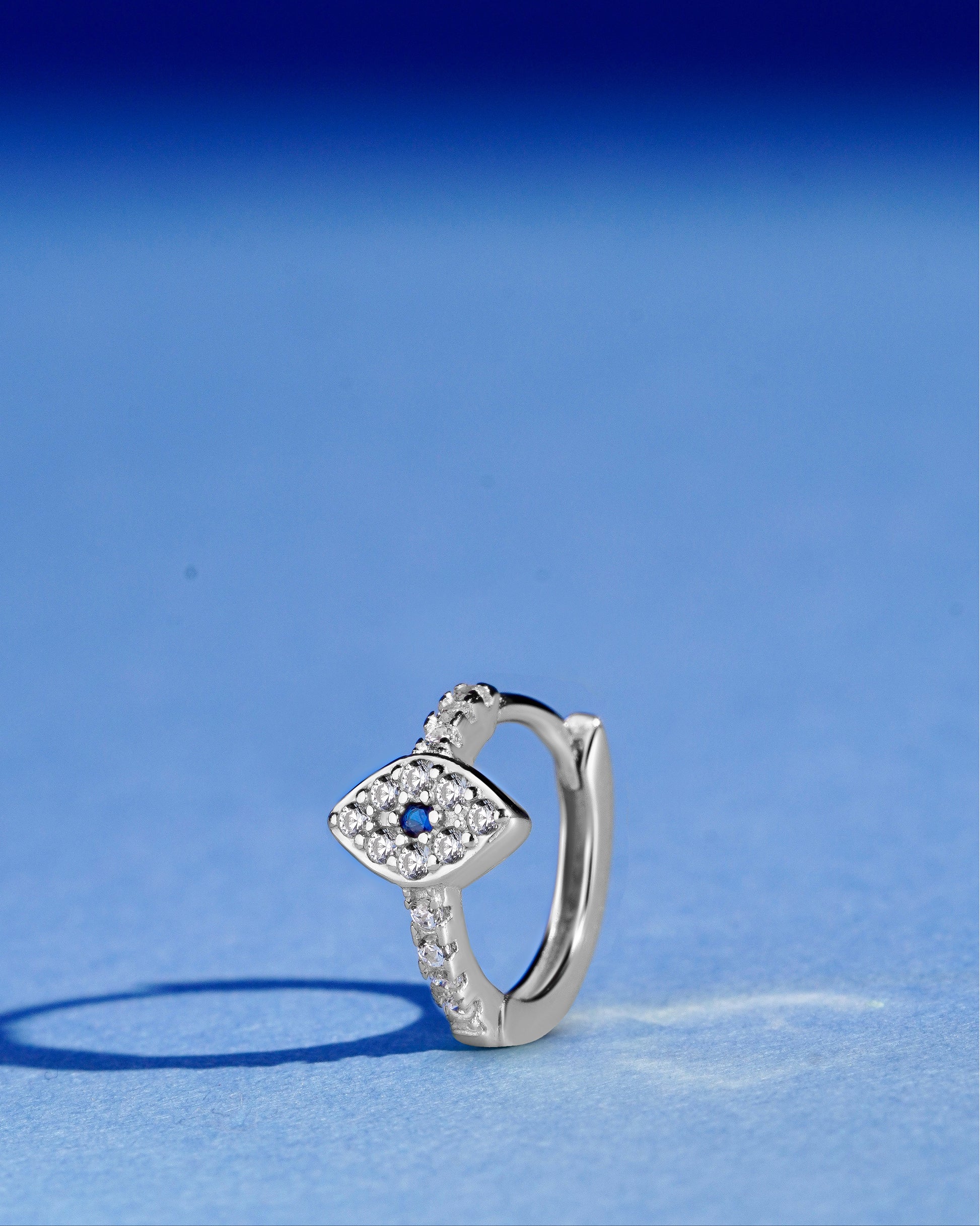 Trendy Evil Eye Huggee hoops in 92.5 silver, rhodium plated with sparkling 5A+ zirconia stones. The protective charm adds subtle shimmer and modern style, ideal for stacking or wearing alone to elevate everyday looks.