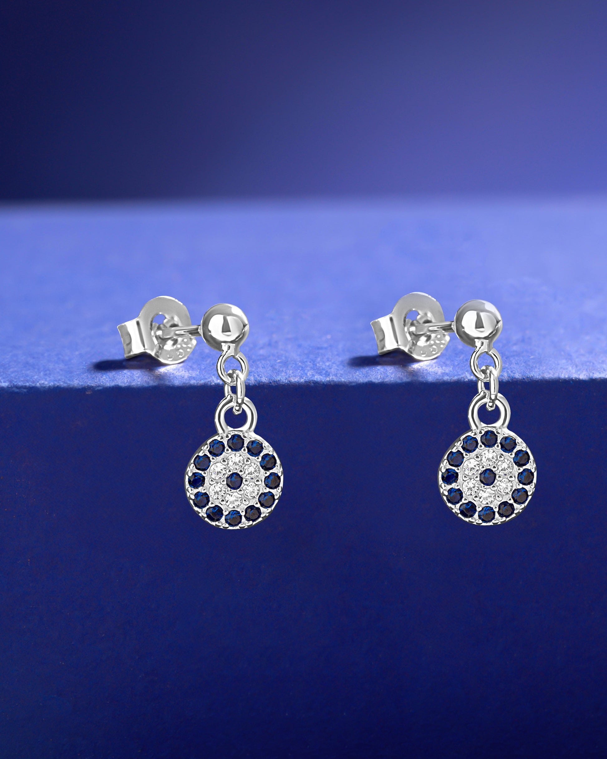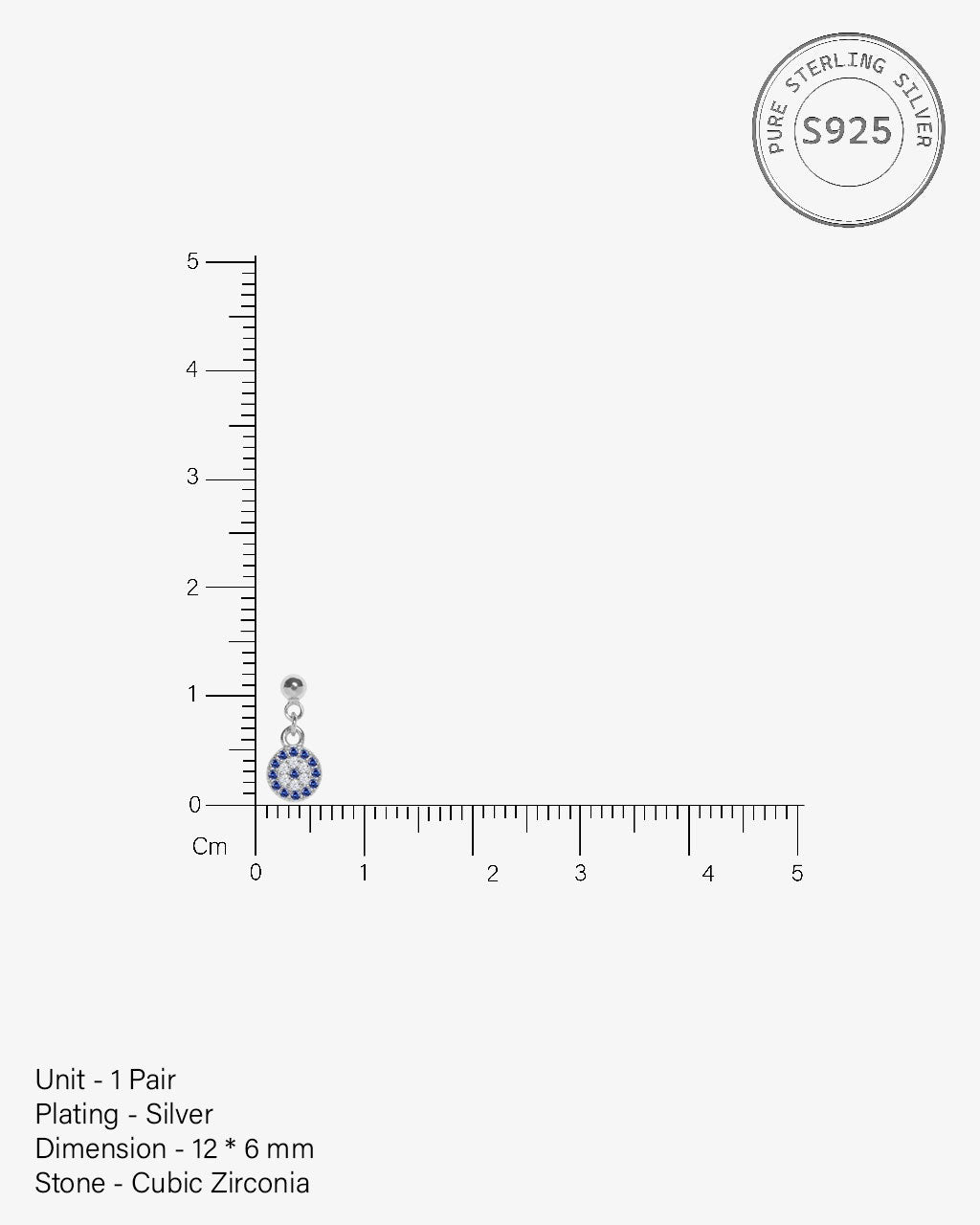 Silver Ball Eye Hanging Stud Earrings in 92.5 silver with rhodium plating and 5A+ zirconia stones. Contemporary dangling design with sparkling detail for stylish and versatile jewelry looks.