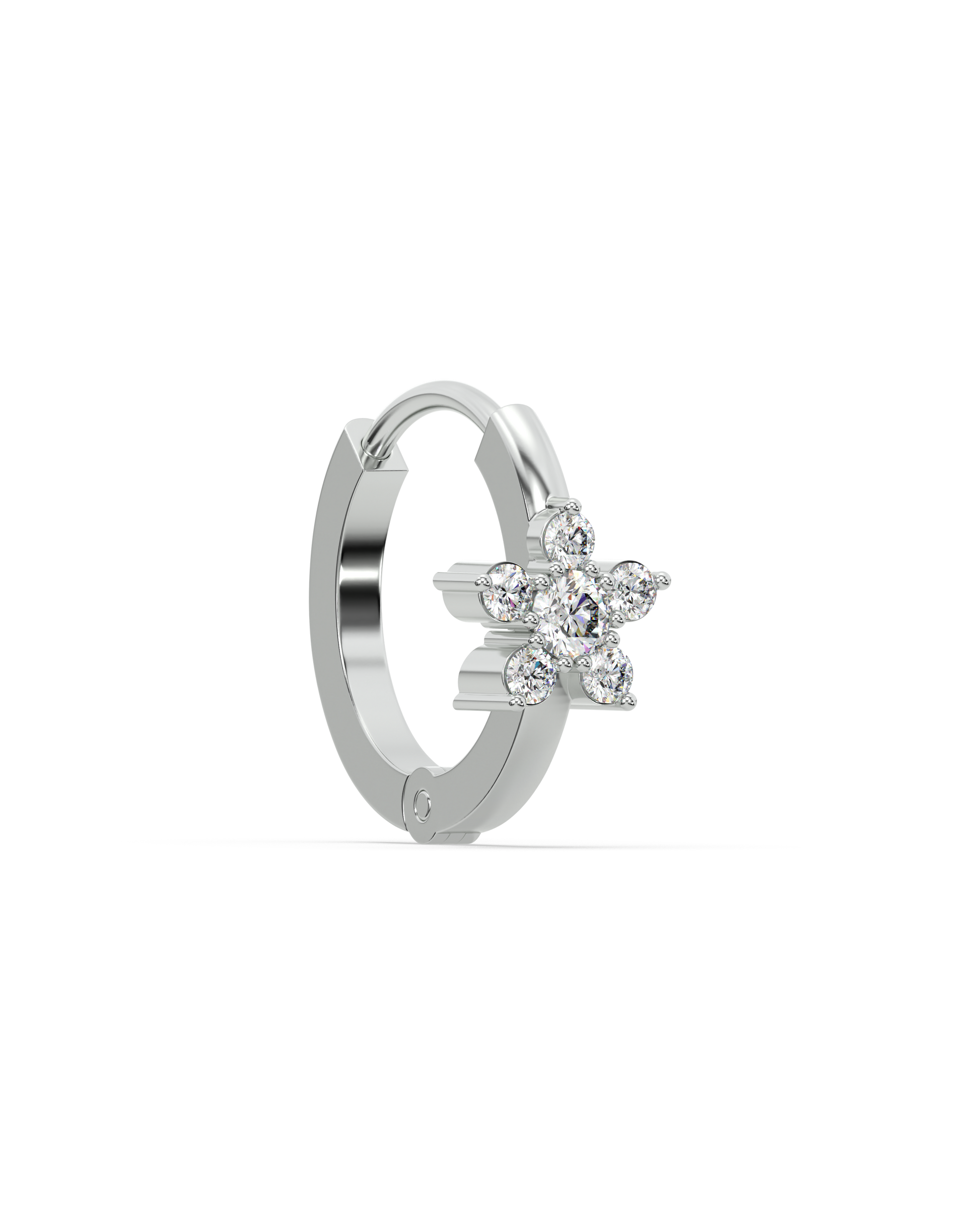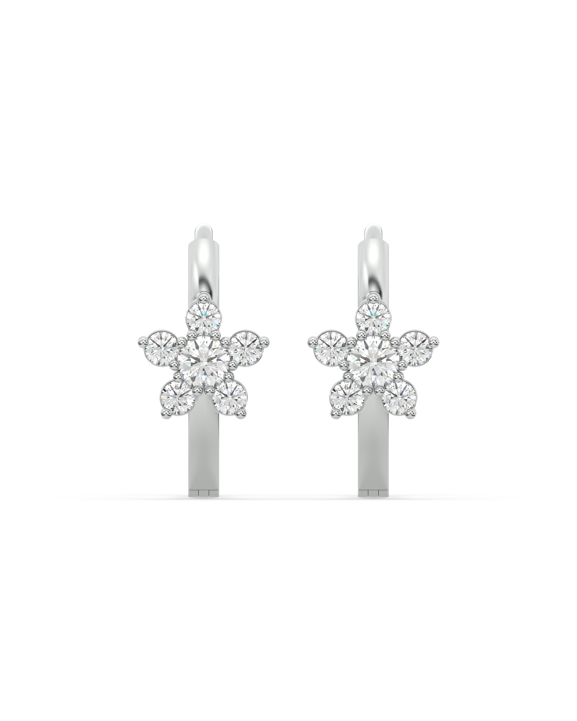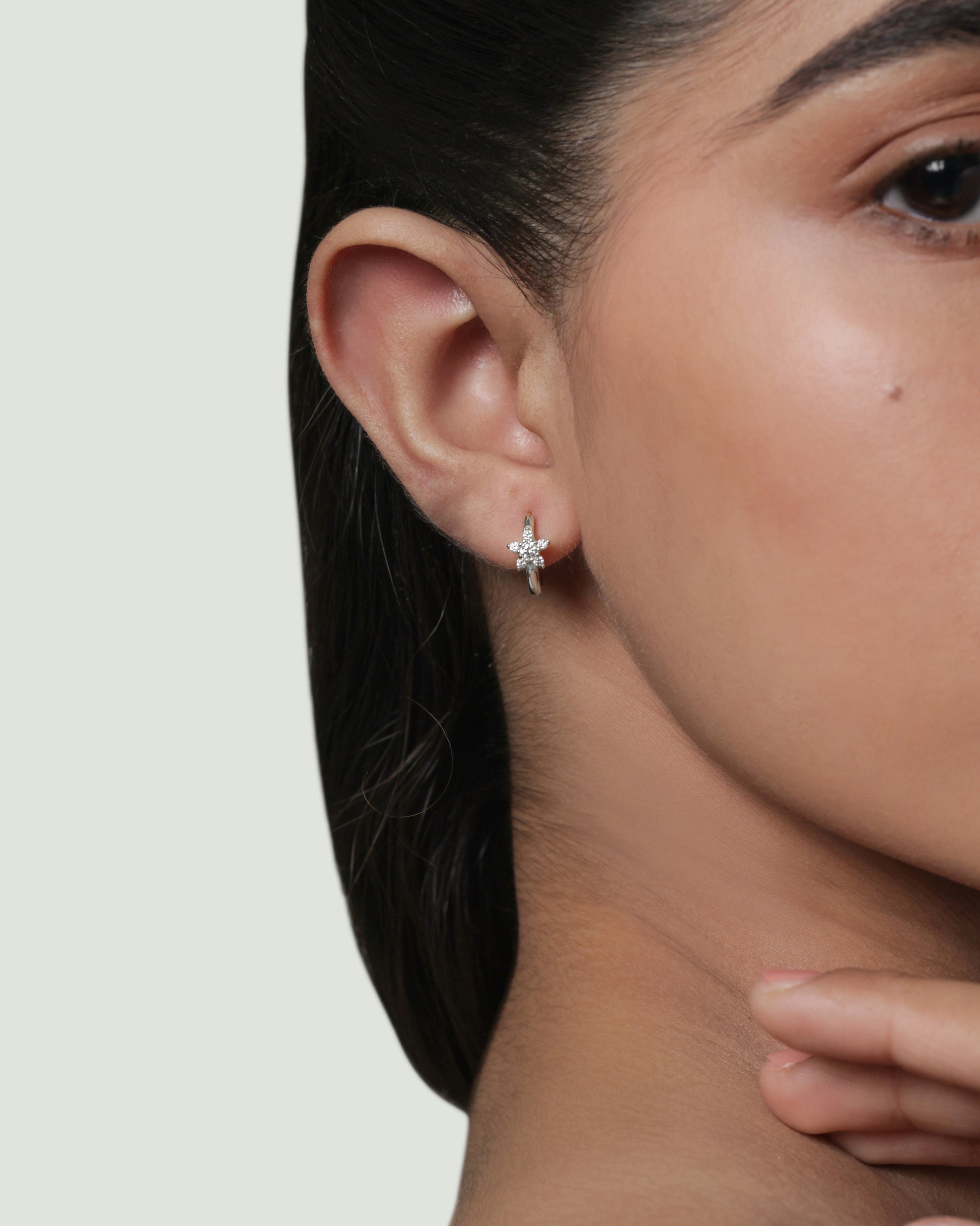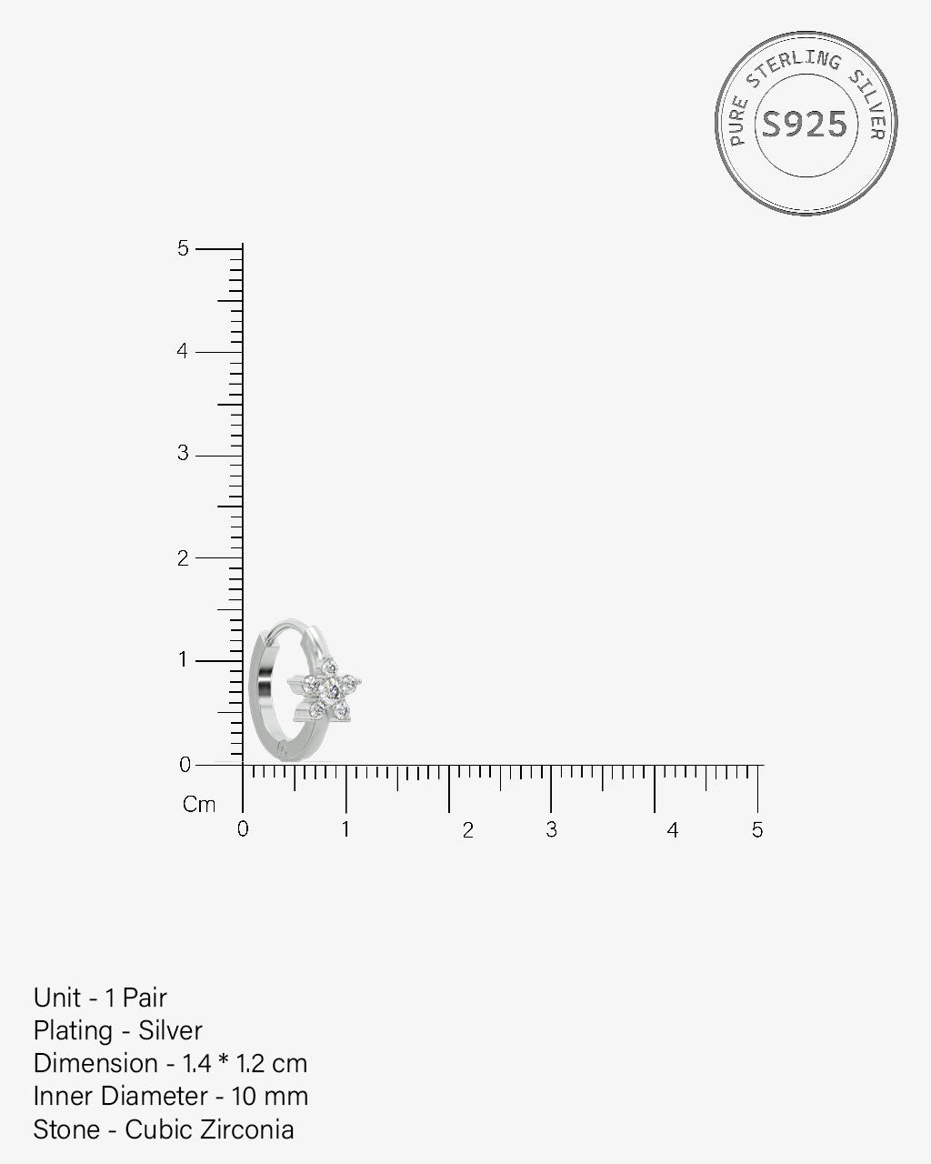Chic Floral Silver Hoops in 92.5 silver, rhodium plated with 5A+ zirconia stones. The intricate floral design adds sparkle and sophistication, perfect for layering or wearing solo to complement casual and evening outfits.