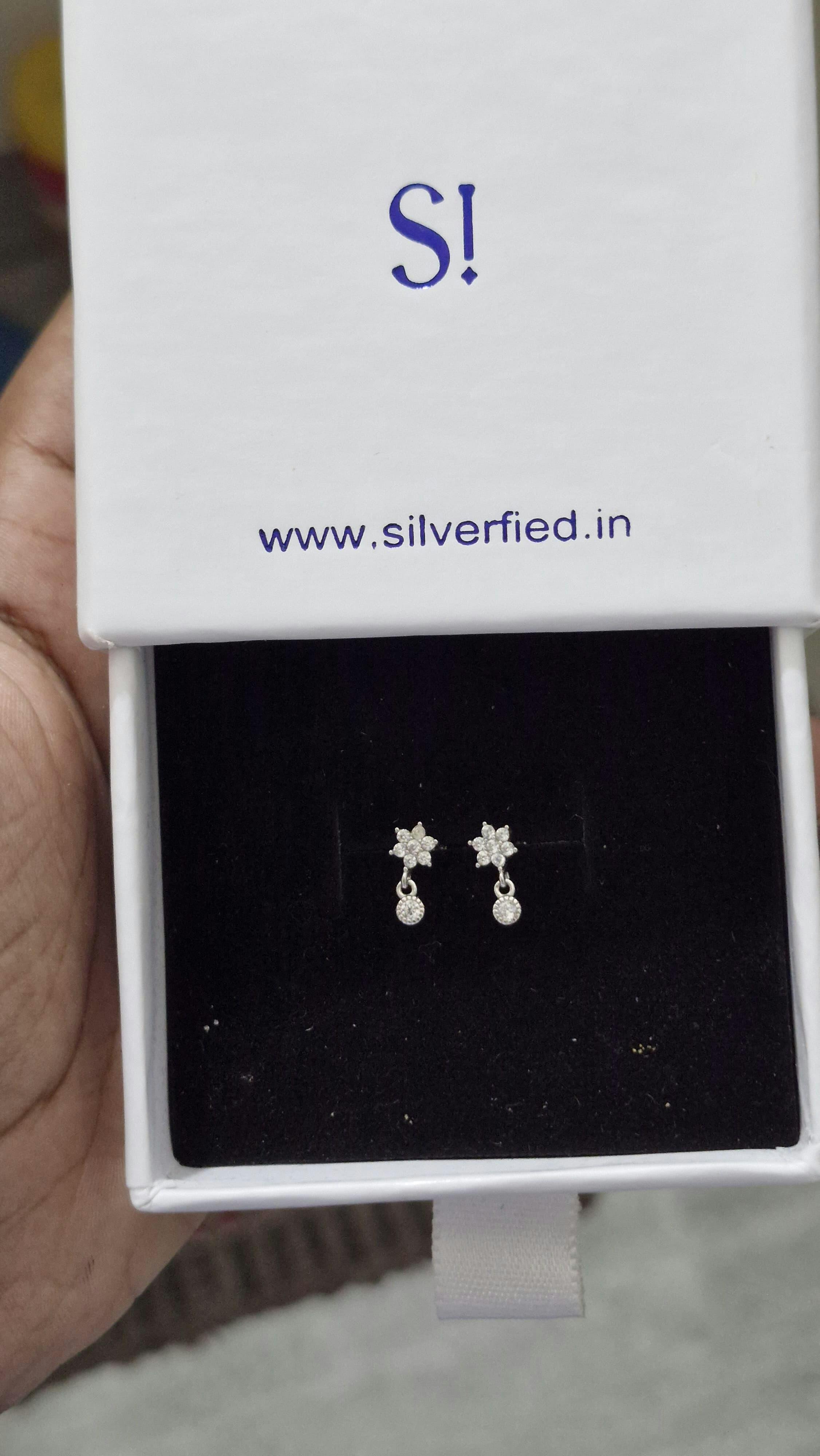 Flower Dangler Zirconia Drop Stud Earrings crafted in 92.5 silver with 5A+ zirconia stones and rhodium plating. A sparkling floral drop design that blends grace and shine, perfect for elevating everyday or festive looks.