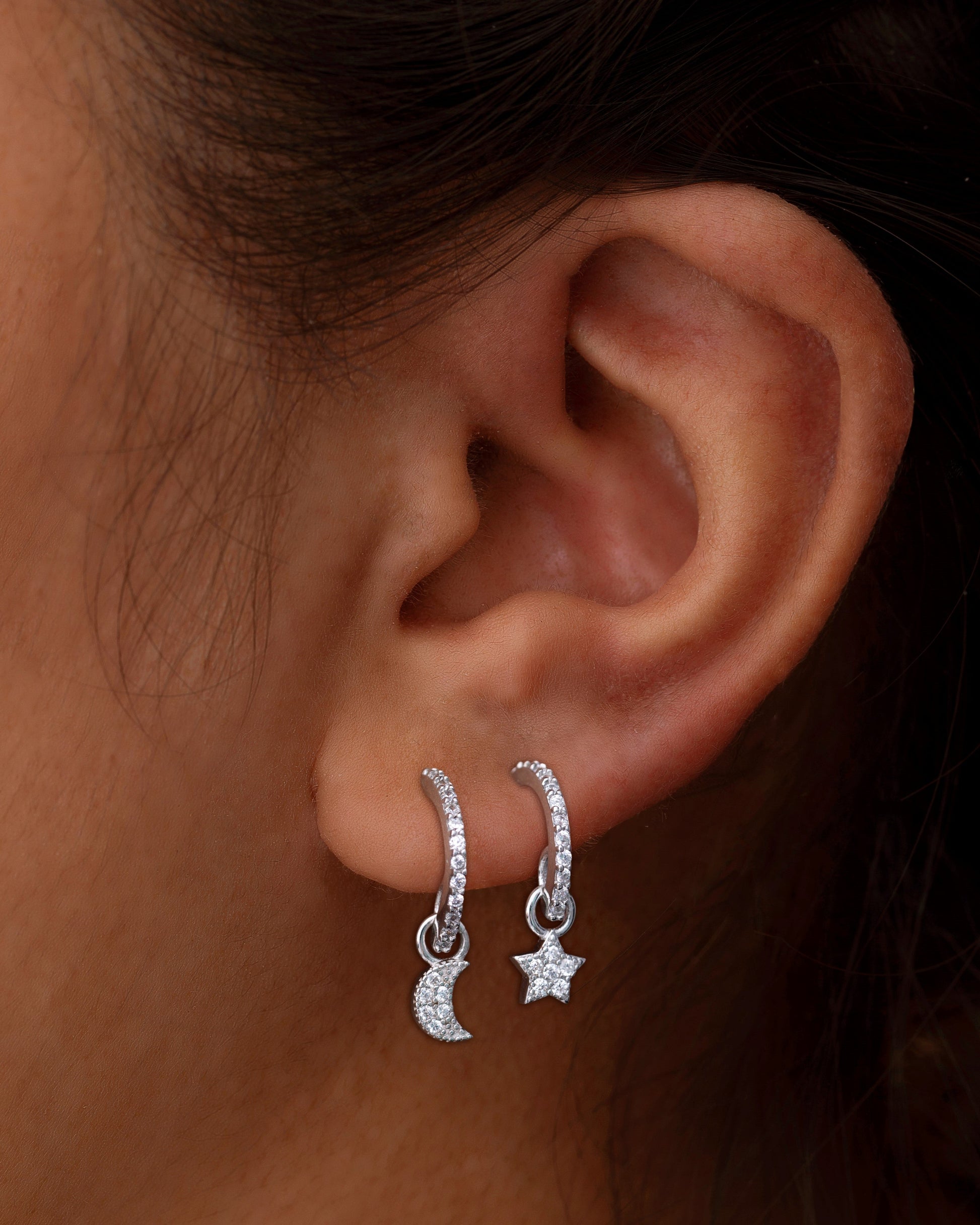 Celestial charm meets style with these Rhodium-Plated Mismatched Half Moon Star Hoop Earrings. Crafted in 92.5 silver with sparkling 5A+ zirconia stones, the unique half-moon and star design adds playful elegance to any look.