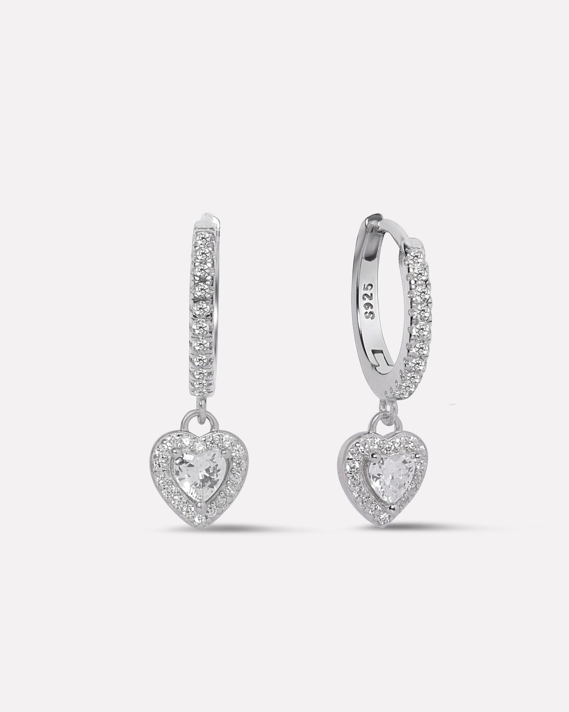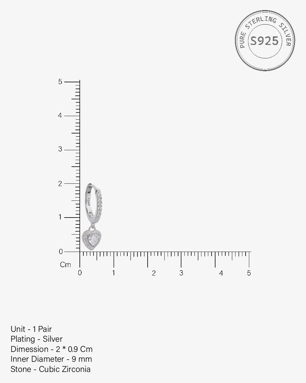 Romantic Eternal Love Solitaire Heart hoops in 92.5 silver, rhodium plated with sparkling 5A+ zirconia stones. The heart-shaped solitaire design adds timeless elegance, perfect for gifting or adding a delicate shimmer to everyday and evening looks.