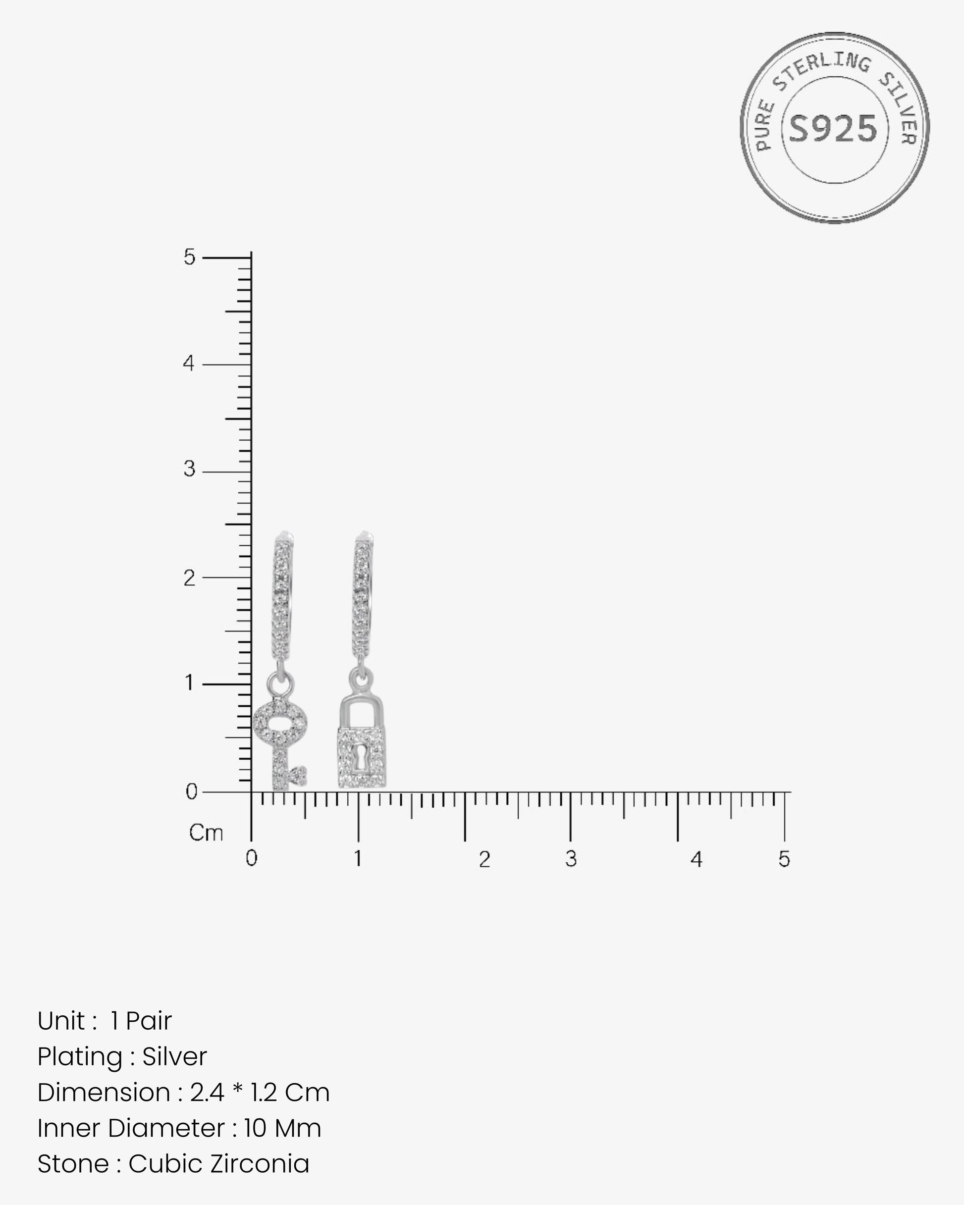 Elevate your style with 'Key To My Lock' charm hoops in 92.5 sterling silver, rhodium plated with dazzling 5A+ zirconia stones. Featuring a playful key motif, these hoops add a whimsical sparkle, perfect for layering or making a statement with modern elegance.