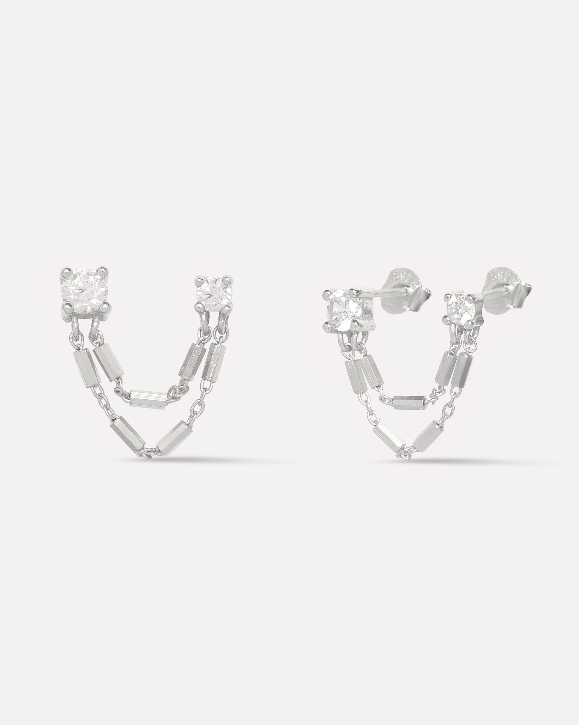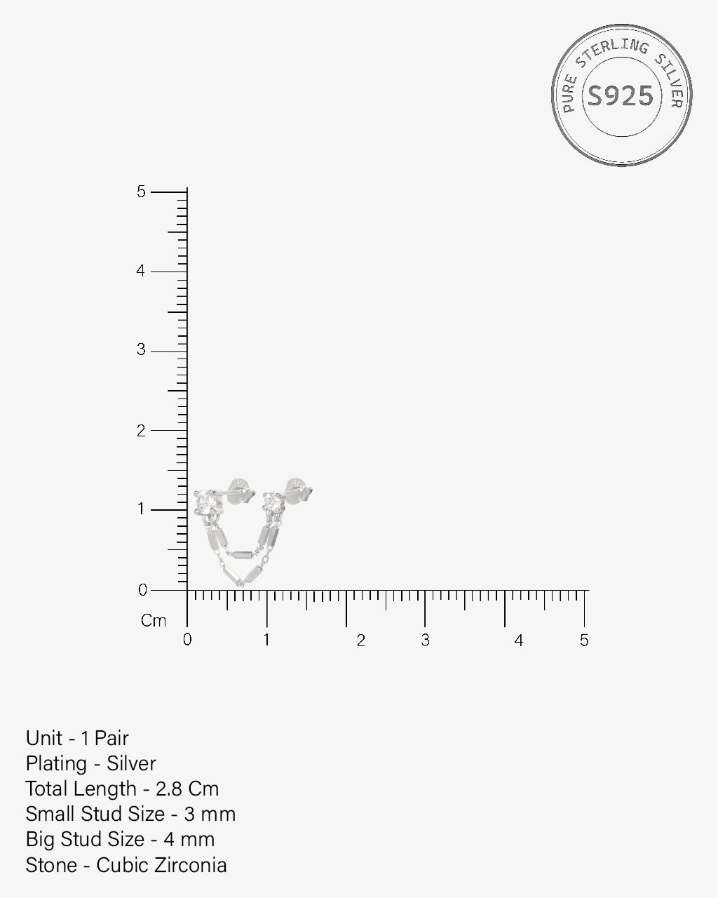 Long Tail Two Stone Chain Connector Earrings in 92.5 sterling silver with 5A+ zirconia stones, 14K gold plated for luxury. Featuring two sparkling stones on a long chain design, these elegant earrings add sophistication and shine, ideal for gifting or elevating any outfit.