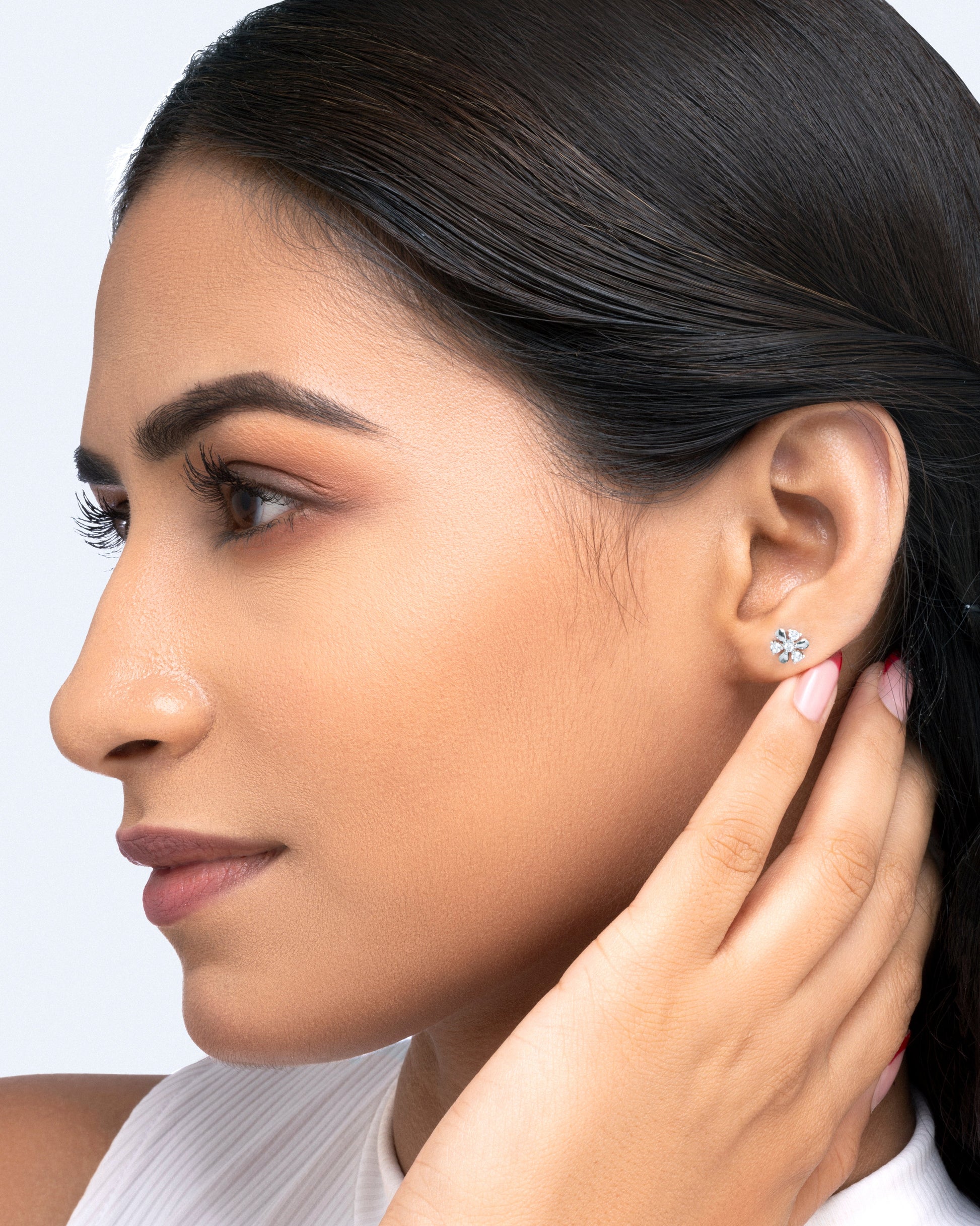 Luxe Flower Minimalist Stud Earrings in 92.5 silver with rhodium plating and 5A+ zirconia stones. A refined floral design offering sparkling simplicity, ideal for daily wear or layered modern jewelry looks.