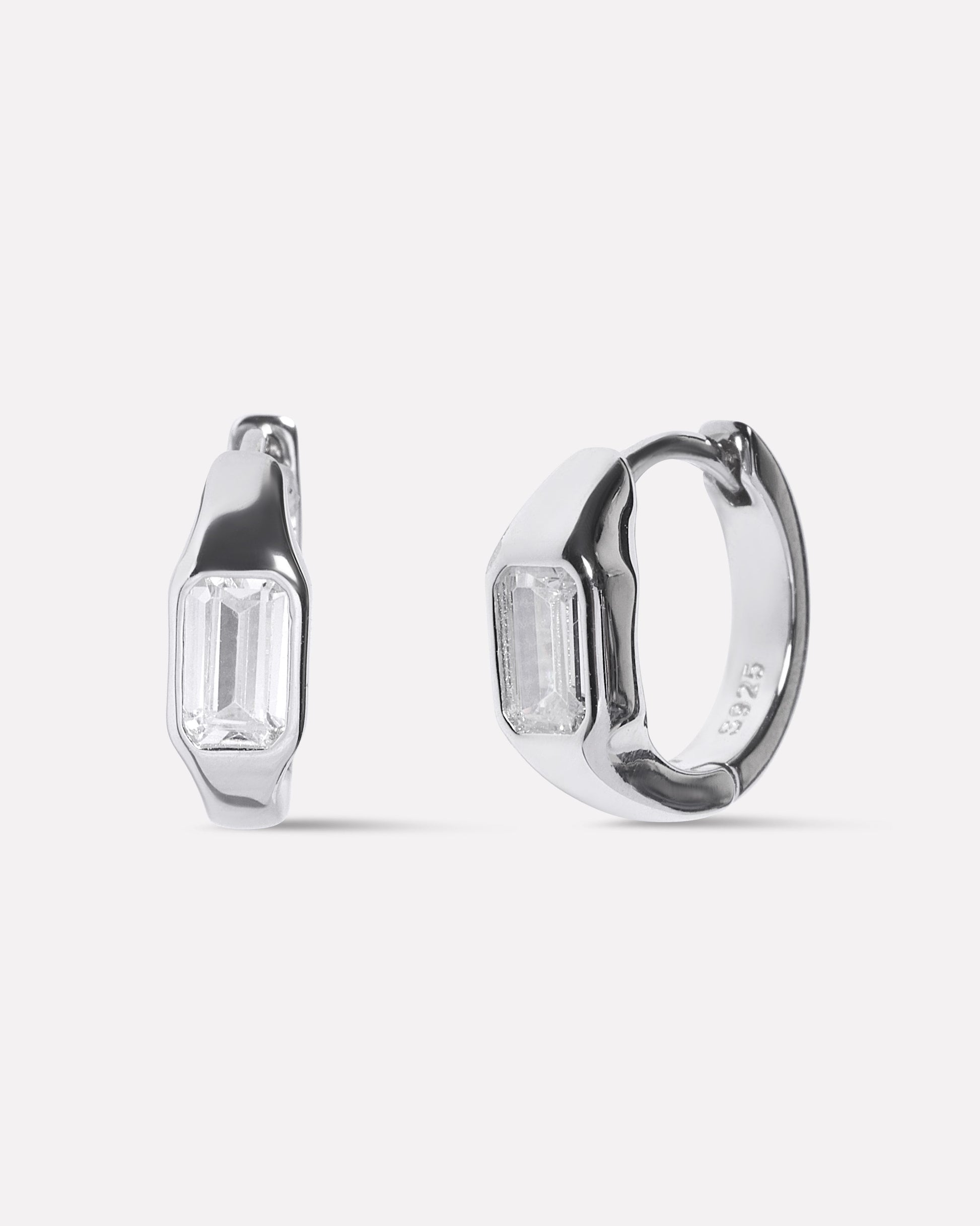 Contemporary Modern Sleek Bar hoops in 92.5 silver, rhodium plated with 5A+ zirconia stones. The linear bar design adds subtle sparkle and refined style, perfect for layering or making a modern statement.