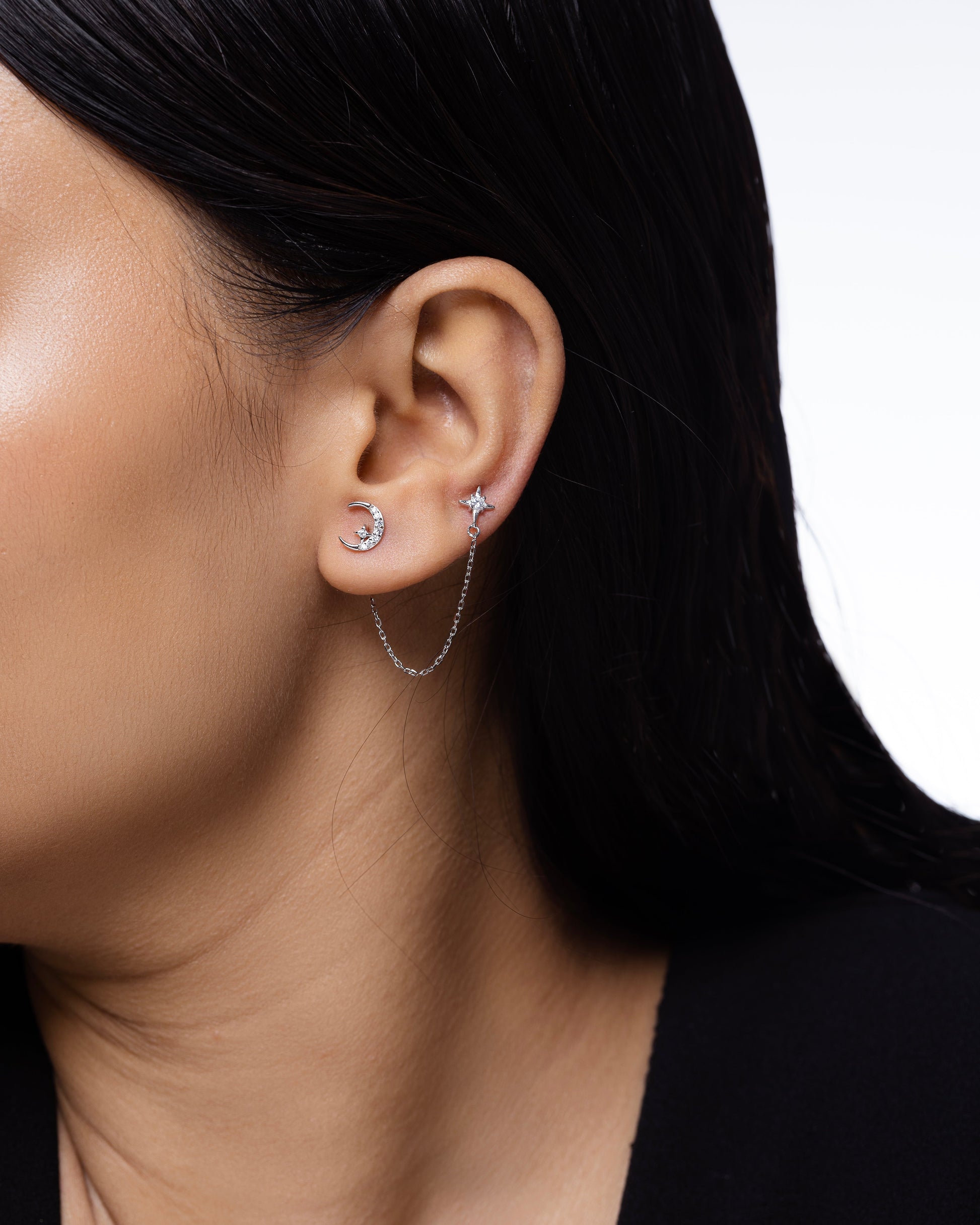 Moon Star 3-In Connector Chain Earrings in 92.5 sterling silver with 5A+ zirconia stones. Rhodium plated, featuring celestial moon and star charms for layered, stylish elegance, perfect for gifting or everyday wear.