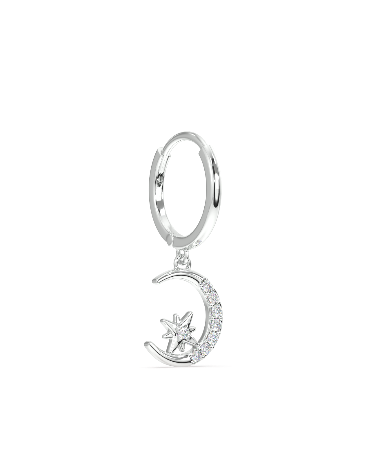 Celestial-inspired Zircon Moon With Star hoops in 92.5 silver, rhodium plated with 5A+ zirconia stones. The moon and star motif adds whimsical elegance, perfect for both day and night styling.
